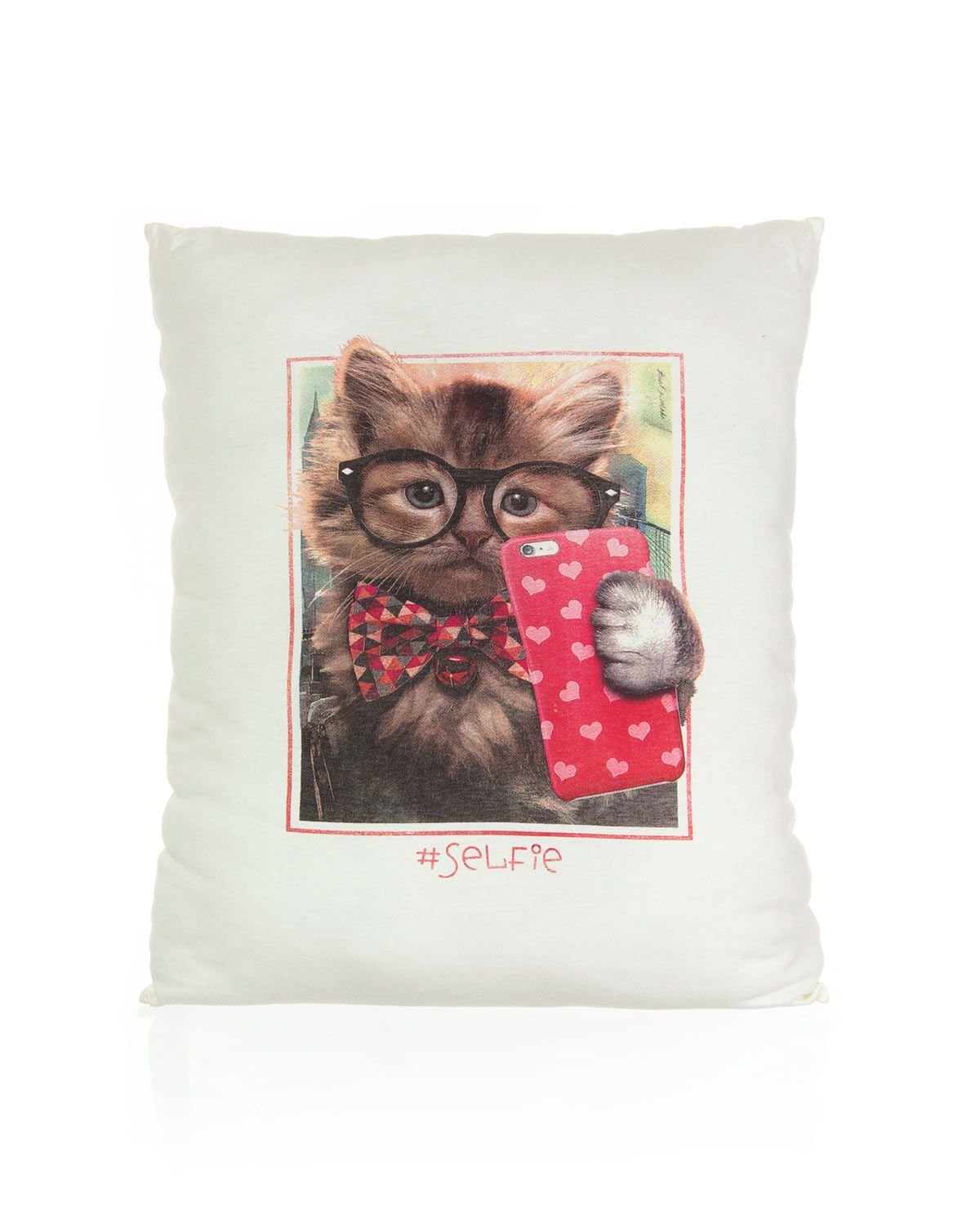 Essa almofada tem estampa meiga de gato tirando uma selfie e é feita em algodão, o que proporciona maior leveza, maciez e conforto para que não haja noites mal dormidas.
