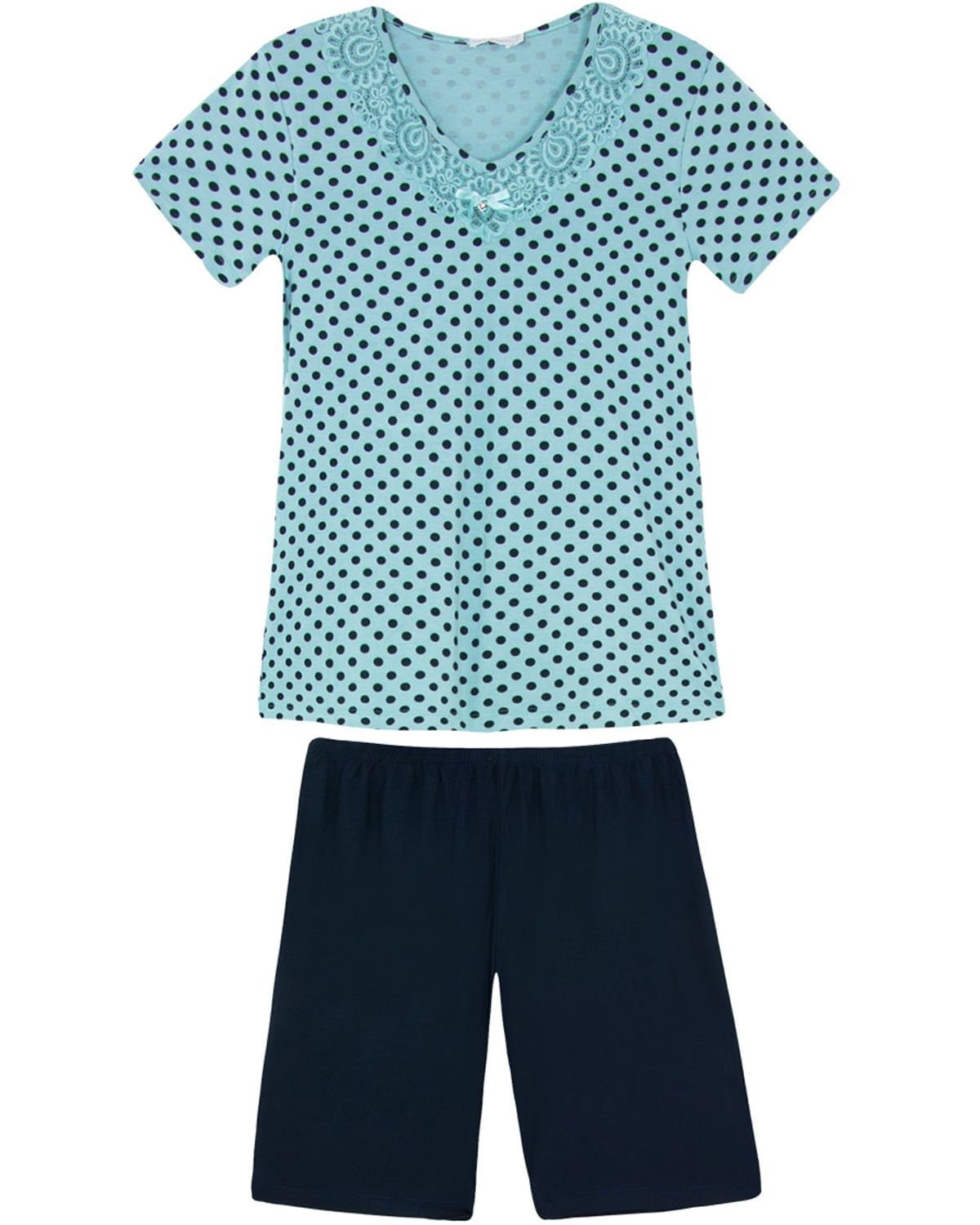 Este pijama é aquele aconchego necessário, todo feito em viscolycra extremamente macia e com moderna estampa poá na blusa manga curta, acompanhada de bermuda lisa numa modelagem tradicional. A peça ideal para garantir mais beleza e conforto para suas noites. Destaque para renda no decote, o que deixa a peça ainda mais feminina.