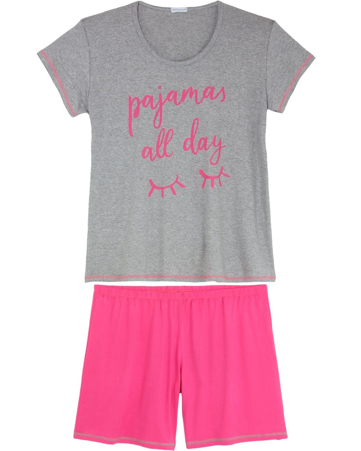Conforto e estilo precisam estar presentes também na hora de dormir, pois alegram as noites e as deixam encantadoras. Esse bermudoll plus size, possui blusa de manga curta confeccionado em um viscolycra de excelente qualidade, garantindo muito conforto e sensação de leveza e bem estar que toda mulher merece. A beleza da peça fica por conta da estampa com a seguinte frase "Pajamas All Day", traduzido para o português "Pijama o Dia Todo". O short rosa cria um look delicado e feminino. Ideal para os dias de verão.