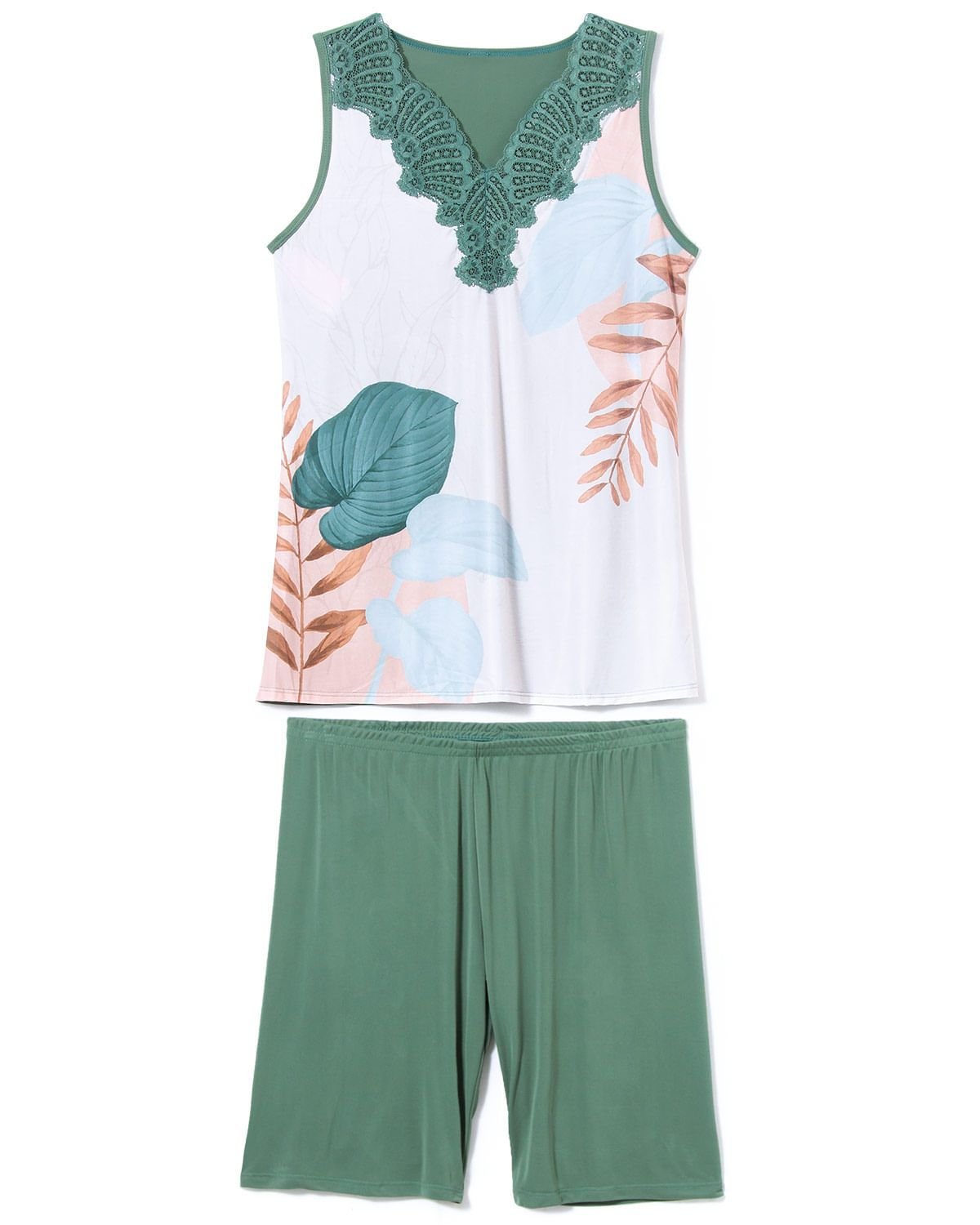 Esse bermudoll traz toda elegância e conforto para os dias mais quentes do ano! Pijama de blusa regata que traz lindo detalhe em renda no decote e estampa exclusiva de folhagens, já a bermuda com modelagem mais soltinha, garante o conforto para os momentos de descanso. Confeccionado em Microfibra Amni®, tecido de toque geladinho, proporcionando leveza e ótimo caimento ao conjunto.