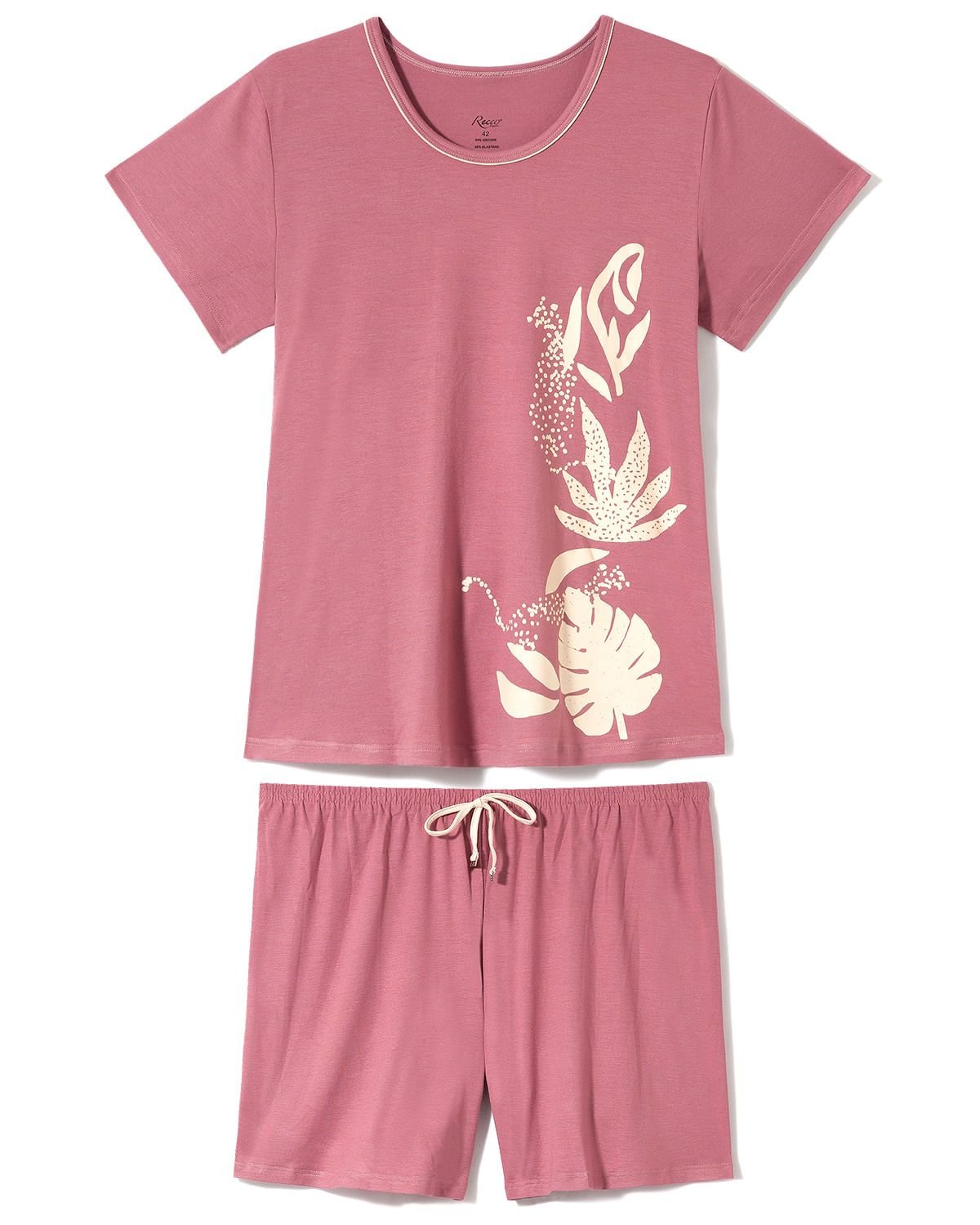Além do debrum na blusa, da estampa de folhagens que realçam o visual e o ajuste decorativo no cós; o elástico bem costurado ao tecido, evita o desconforto e garante que seu pijama tenha uma durabilidade ainda maior.