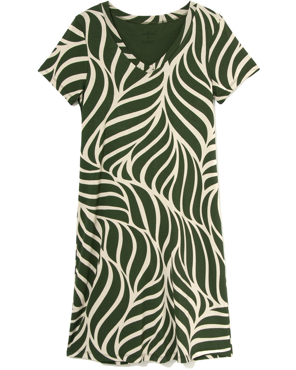 A camisola de manga curta tem modelagem ampla, estilo camisão, e decote v com duplo acabamento, completando o visual que é a cara do verão.