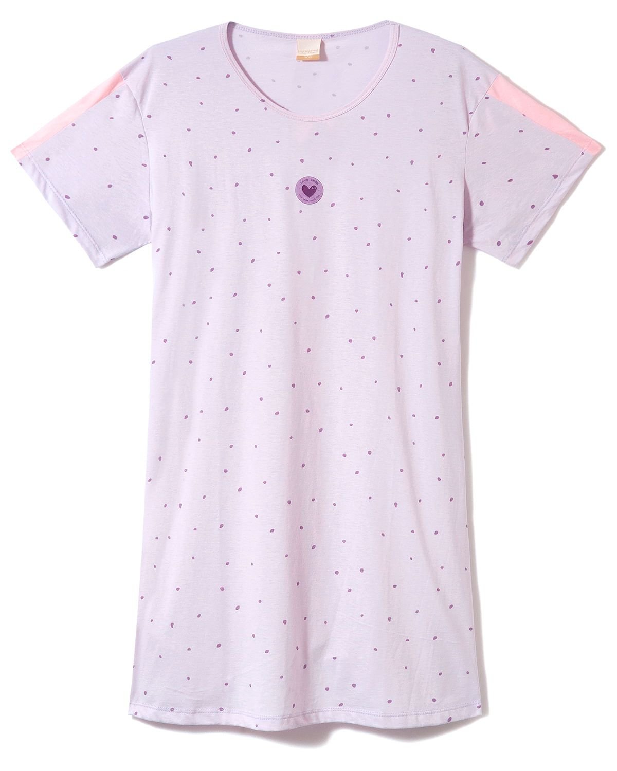 A camisola com estampa de poá desconstruído traz nas mangas um recorte em rosa. Logo abaixo, uma aplicação fofa com textura aveludada exibe a frase: "Leve amor por onde você for."
