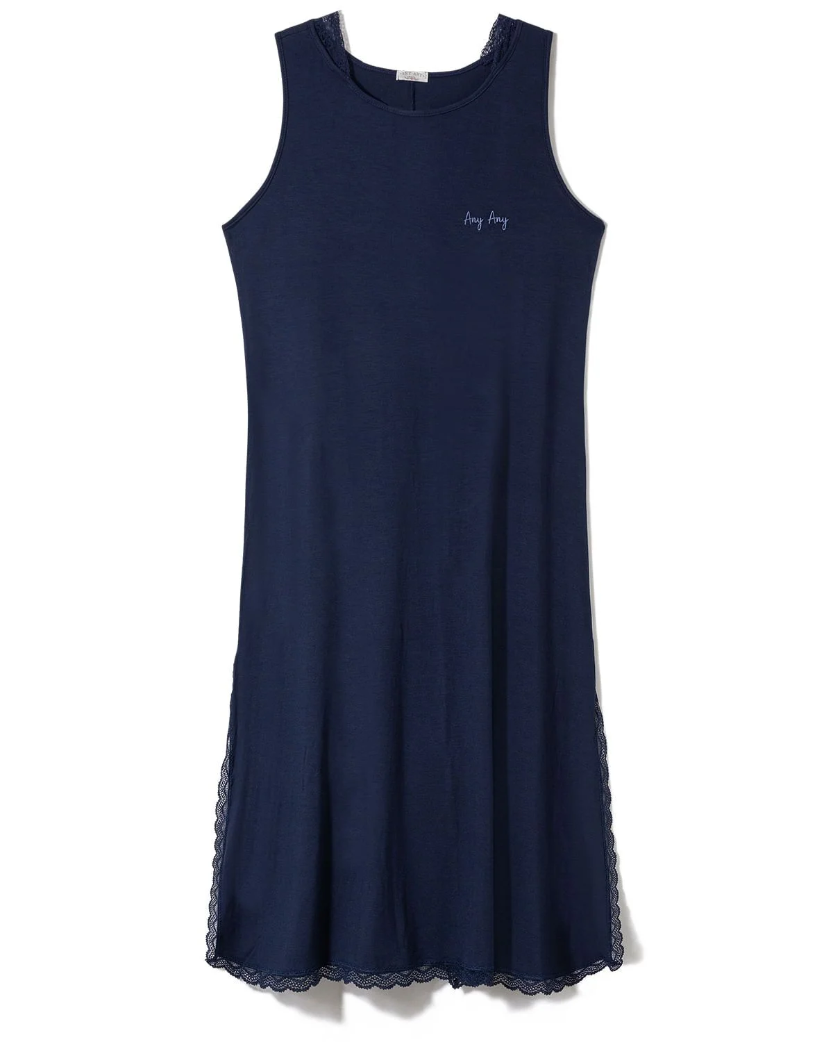 A camisola regata de comprimento midi, possui detalhes delicados de renda nos ombros e no acabamento do barrado.