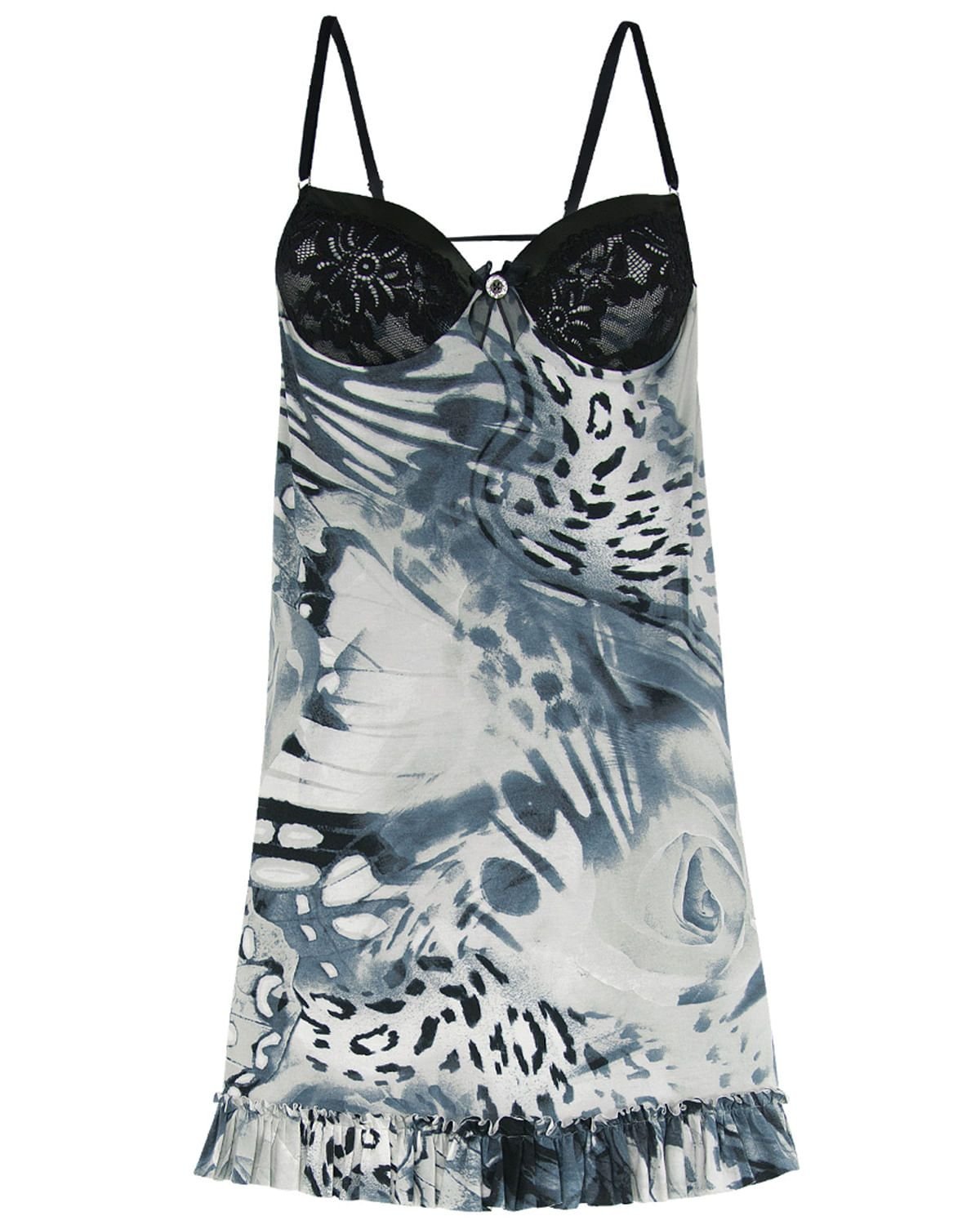 Esta camisola é perfeita para momentos únicos e especiais. Feita em macia viscose com moderna estampa animal print, bojo estruturado com renda e cetim sobrepostos, será difícil não ter uma noite encantadora, sensual e confortável. Destaque para aplicação botão com aplicação de strass no busto.