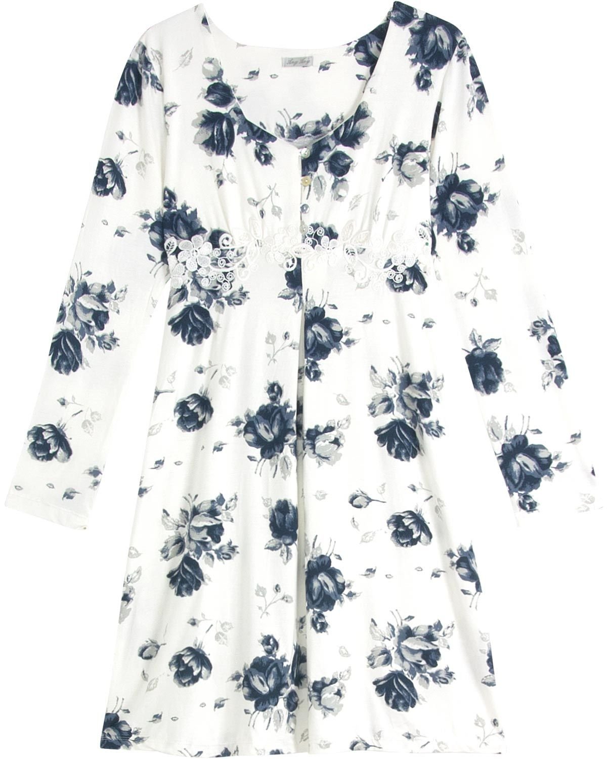 As futuras mamães também desejam se sentirem confortáveis e lindas nos momentos de relax, e as camisolas são perfeitas para isso. Esse modelo toda off white com estampa floral em tons de azul, possui botões no busto, facilitando o momento da amamentação.