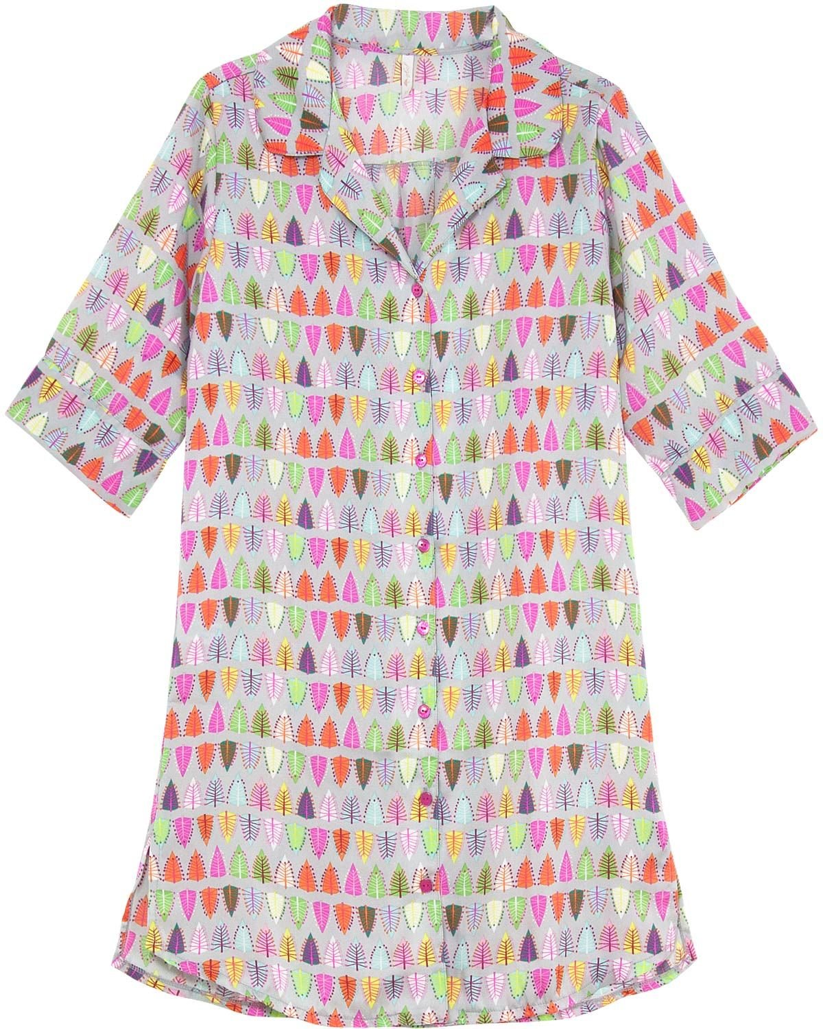 Com corte tradicional e botões frontais, esta camisola é o item perfeito para enfeitar e colorir o cotidiano com muita bossa. A estampa moderna e colorida crescenta feminilidade para as noites de verão cheias de conforto e praticidade.