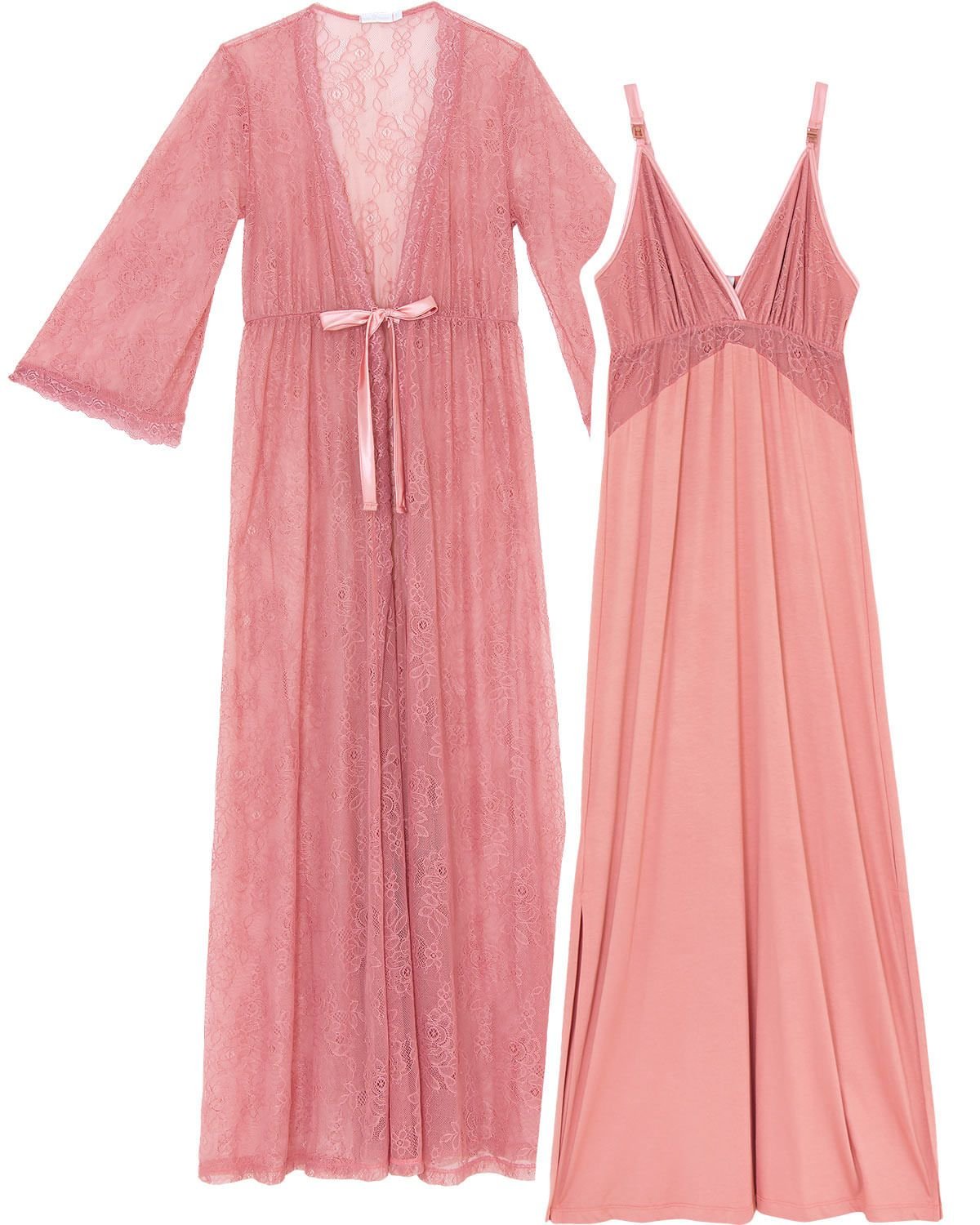 A maternidade é um momento lindo na vida de uma mulher, e para acompanhá-la nessa fase tão mágica este conjunto de camisola com robe é indispensável. A camisola longa confeccionada em viscolycra, tem o busto em renda com alças de cetim, fendas nas laterais e alças com fecho "click", facilitando na hora da amamentação. O robe de mangas flare é todo feito em renda de altíssima qualidade, valorizando a elegância que a mulher precisa para se sentir bem. Destaque para amaração do robe em cetim.