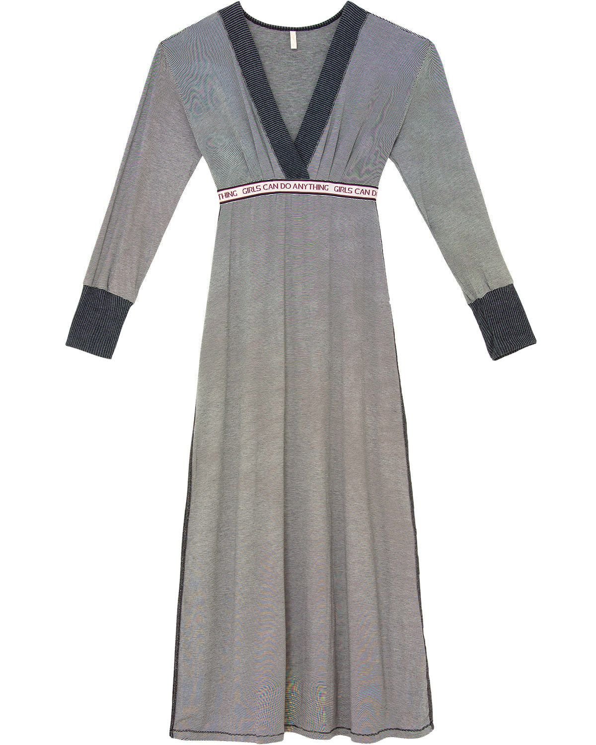 A camisola longa é uma peça super elegante que valoriza o corpo feminino. Esse modelo de manga longa possui malha listrada e detalhes em elásticos com frases, que está super na moda, como também o lurex nas laterais e o decote alongado, que fazem toda a diferença. Pensando no conforto e delicadeza, é confeccionada em viscolycra extremamente macia, tecido que garante um caimento perfeito e uma sensação leve na pele.