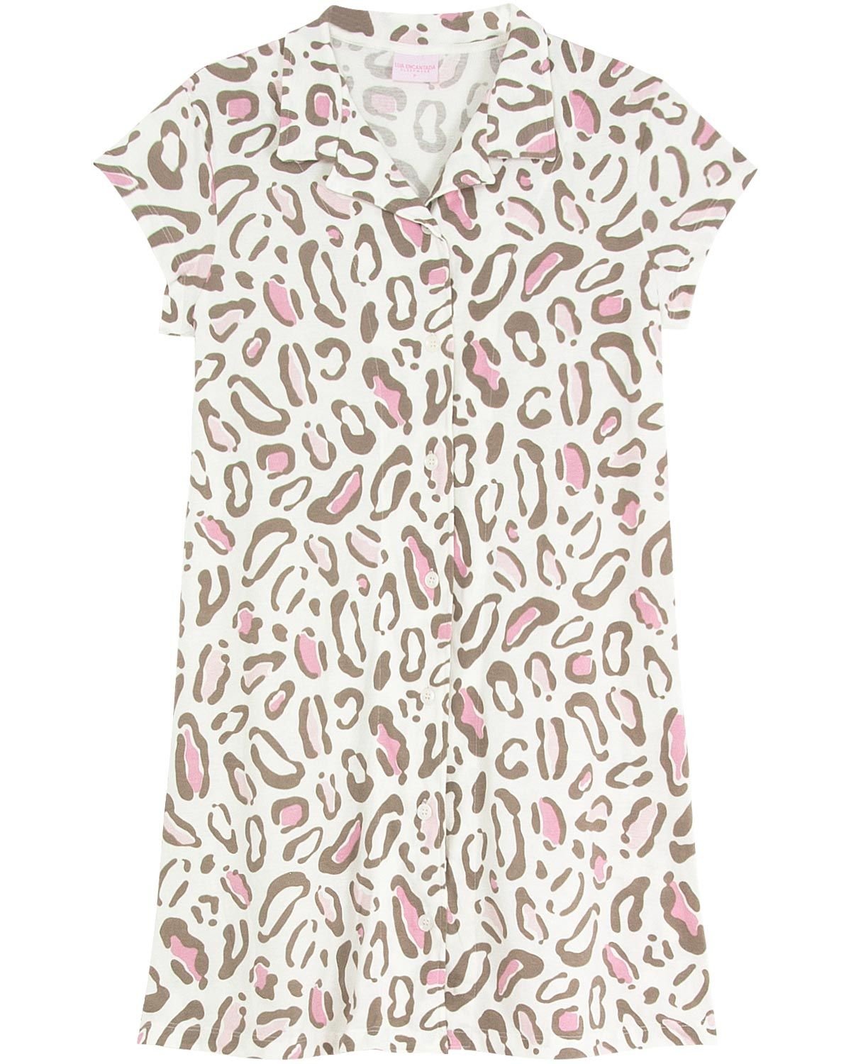 A camisola é um item indispensável quando a prioridade é o conforto e a comodidade. Esse modelo possui gola e é aberto com botões frontais, o que garante ainda mais praticidade para o momento de dormir. Além disso, tem estampa de oncinha, seguindo a tendência do animal print, com detalhes em rosa, garantindo a modernidade e o visual encantador que toda mulher deseja.