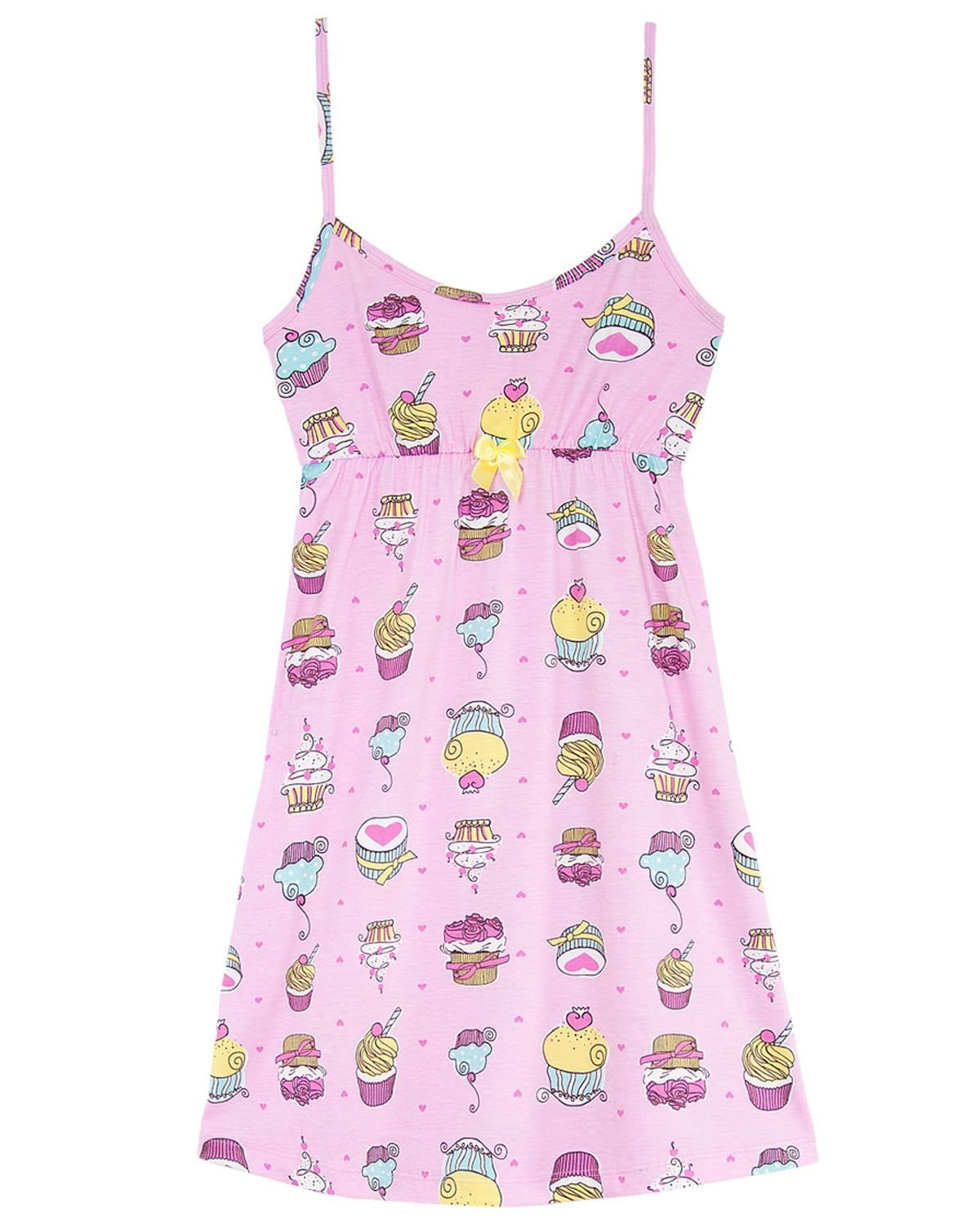 A camisola é confeccionada de um leve tecido de algodão, de alça e com estampas divertidas de cupcakes para trazer conforto e beleza para as noites de verão. Destaque para o lacinho frontal em cetim.