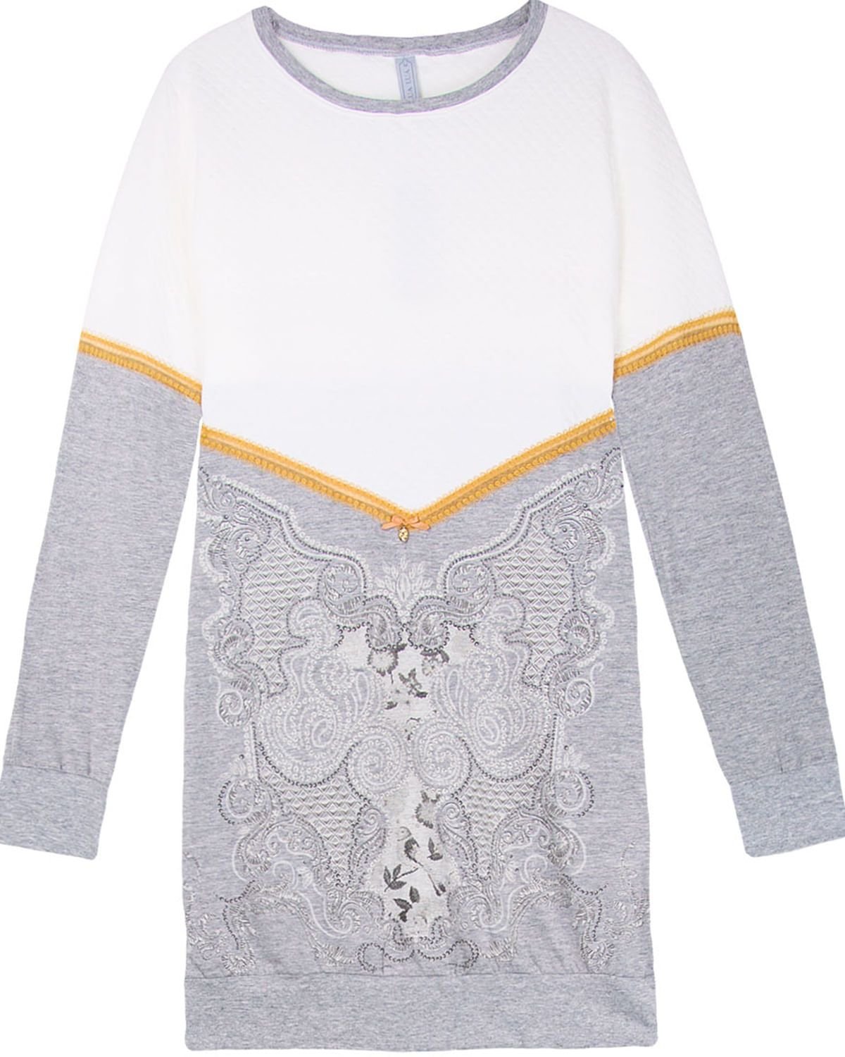 A camisola é super charmosa, fina e delicada. Feita com tecido Jacquard Metalassê e algodão 100%, é impossível não ficar confortável! Parte frontal com estampas de arabescos e delicado detalhe de fita na parte abaixo do busto. Destaque para manga e barra com punho para melhor ajuste ao corpo, e laço de cetim com pingente no busto.