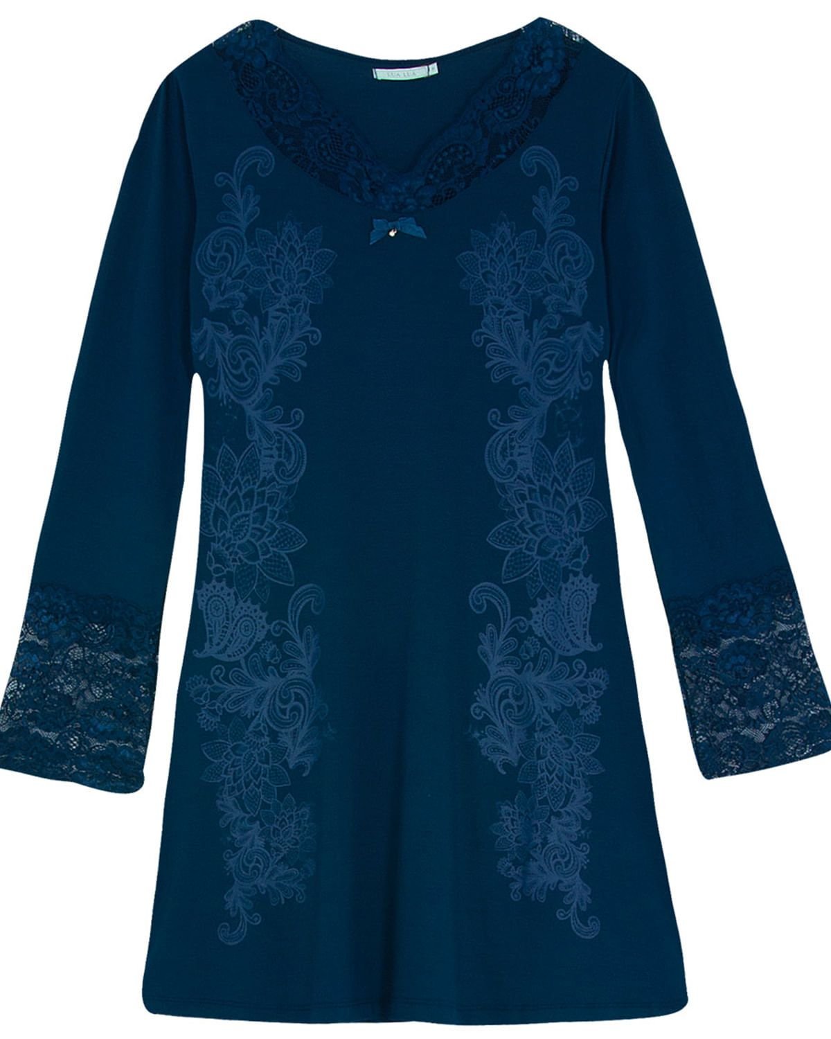 Está camisola é ideal para escolhas mais clássicas e necessárias. Feita em viscose de excelente qualidade e fino acabamento em renda na gola e mangas, esta camisola vai encantar seu cotidiano, deixando suas noites extremamente confortáveis e sofisticadas. Destaque para pingente com strass no decote, dando um toque ainda mais feminino a peça.