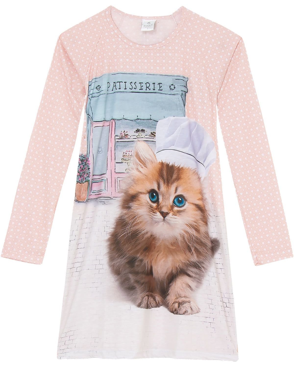 Uma linda opção de camisola estilo camisão, com manga longa com estampa de corações, frente com arte em silk de gato. Peça confeccionada em viscoflex, uma combinação pensada para proporcionar toque macio, leveza e conforto para suas noites.