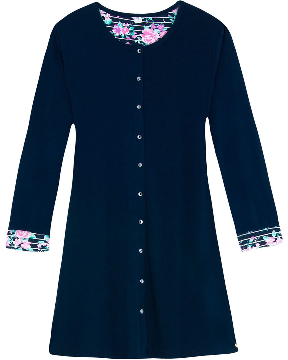 Está camisola é ideal para escolhas mais clássicas. Feita em viscose, com abertura frontal e punhos em tecido floral,para encantar seu cotidiano, deixando suas noites extremamente confortáveis e femininas.