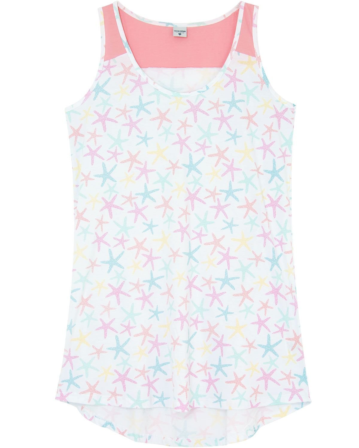 Uma camisola plus size modelo "mullet", fresquinha e alegre, é ideal para as noites de verão! Trazendo estilo regata, possui linda estampa de estrelas do mar com recorte rosa nos ombros. É confeccionada em malha 100% algodão, um tecido leve e ideal para o calor, pois transmite suavidade e conforto.