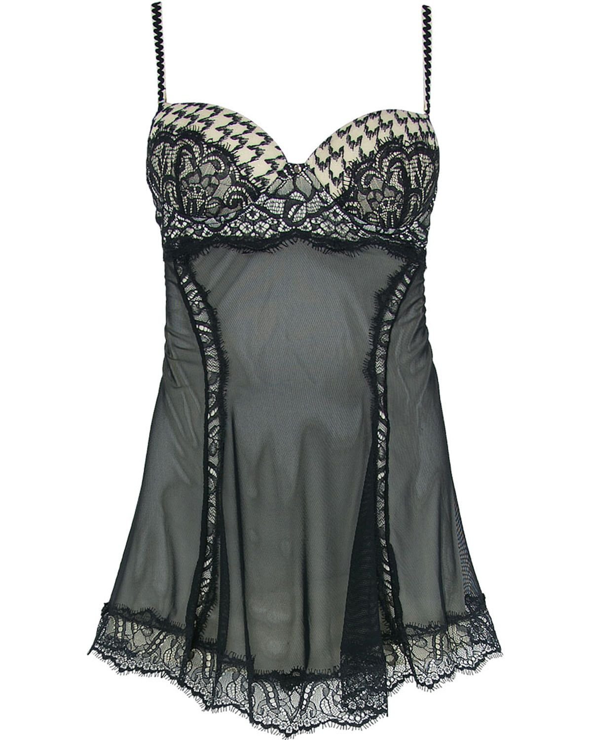 Surpreenda e encante com esta camisola, em microfibra nude sobreposta a um tule preto acinturado com saia em godê. Possui recortes curvados acabados em renda que valorizam as formas do corpo trazendo mais feminilidade e sensualidade na medida. Com bojo estruturado todo trabalhado em guipure e renda Travaillé e alça com acabamento delicado e moderno é a peça perfeita para aguçar a feminilidade em noites especiais repletas de segundas intenções.