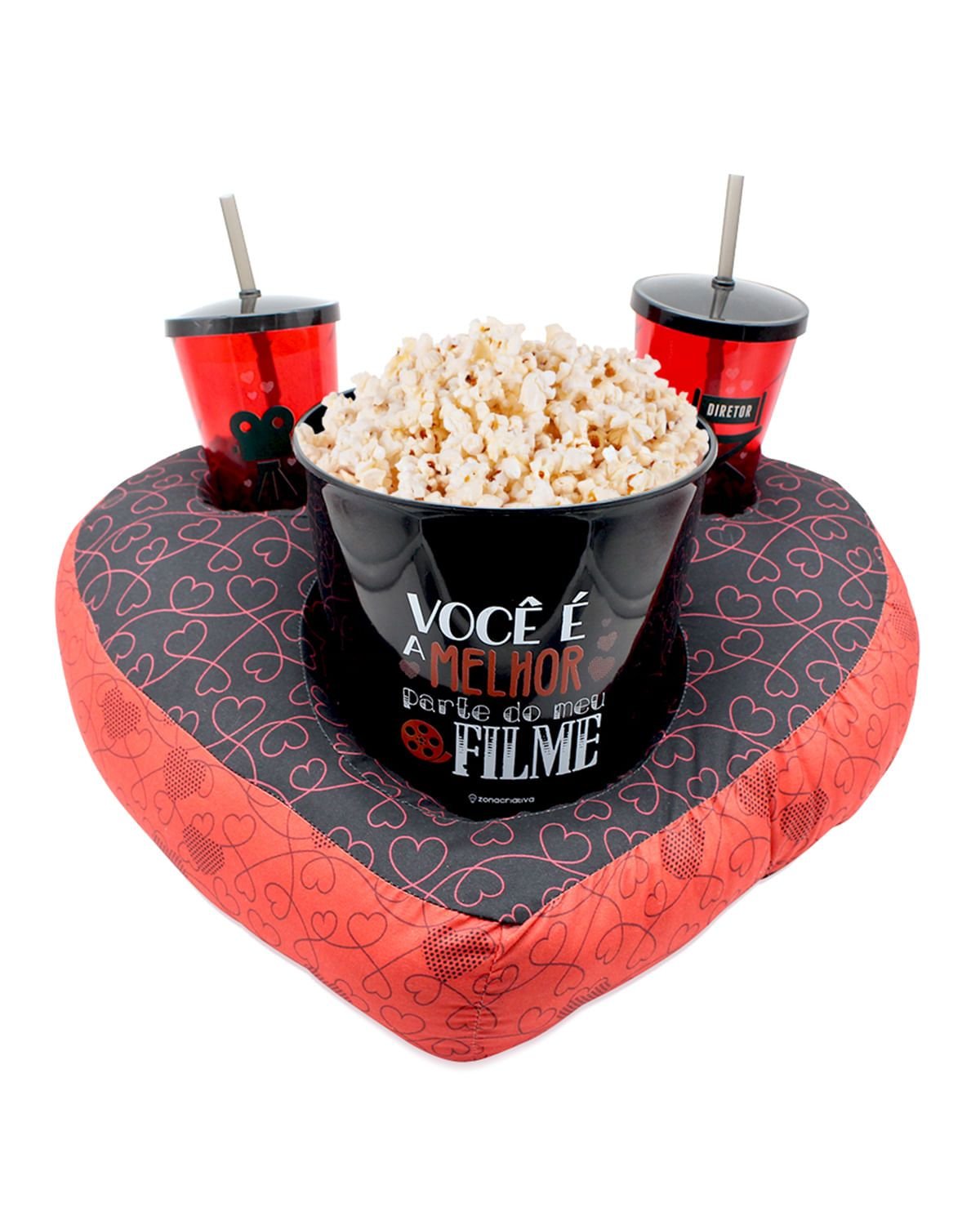 A almofada porta pipoca já é ideal para apreciar um bom filme, junto com todo o conforto e esse kit em formato de coração deixa o momento ainda mais gostoso e romântico quando acompanhada de quem amamos.