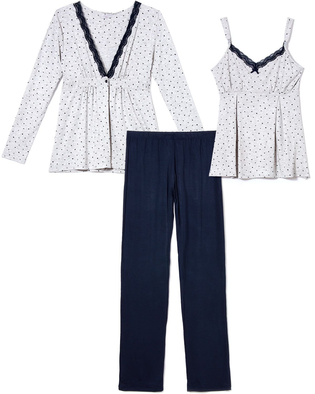 Esse trio é perfeito para momentos onde a praticidade e o conforto andam alinhados com o charme e combinação de cores. A regata estampada com poá possui decote rendado e fechos nas alças, que também dá a opção das mamães amamentarem seus bebês confortavelmente. O casaquinho com um único botão completa a parte superior do pijama com muito estilo, e sua calça com elástico na cintura finaliza o trio com luxo e leveza. O conjunto é confeccionado em Visco Premium, a viscolycra com tratamento especial da Any Any, que garante um toque macio. Destaque para os elásticos nas alças que não deixam ela se perder nas costas.