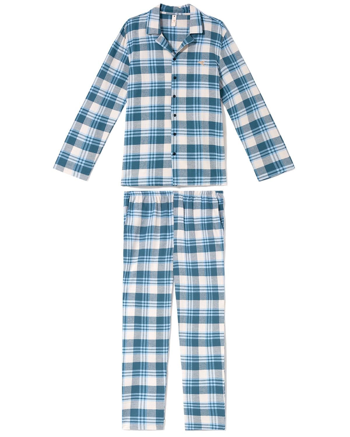 Este pijama xadrez transformará seus momentos de descanso. Confeccionado em Flanela 100% algodão, a malha deste pijama de fibras naturais possui uma tecnologia, onde as fibras passam por uma ação mecânica, permitindo que o ar entre nelas, oferecendo um toque extremamente macio, aconchegante e proteção térmica para os dias mais frios. Este conjunto é composto por blusa com abertura por botões e calça com bolsos nas laterais.