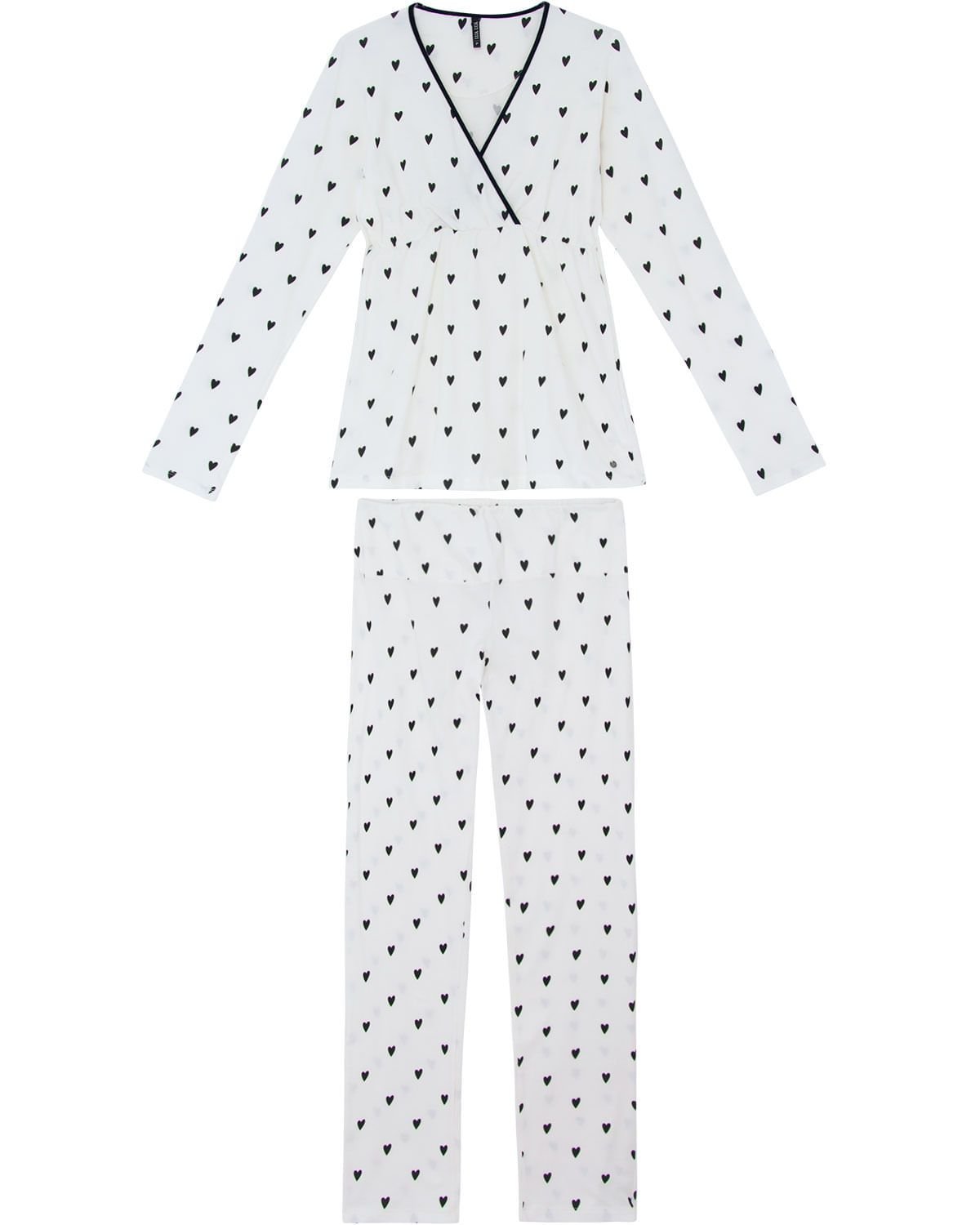 Esse pijama traz um conceito de beleza e sofisticação. O tecido todo em cotton combina com os detalhes da gola, te aquecendo nos dias de inverno. A blusa com linda estampa de corações e sua gola dá a opção das mamães amamentarem seus bebês confortavelmente. A calça estampada, conta com uma textura bem leve, finalizando o pijama com luxo e beleza.