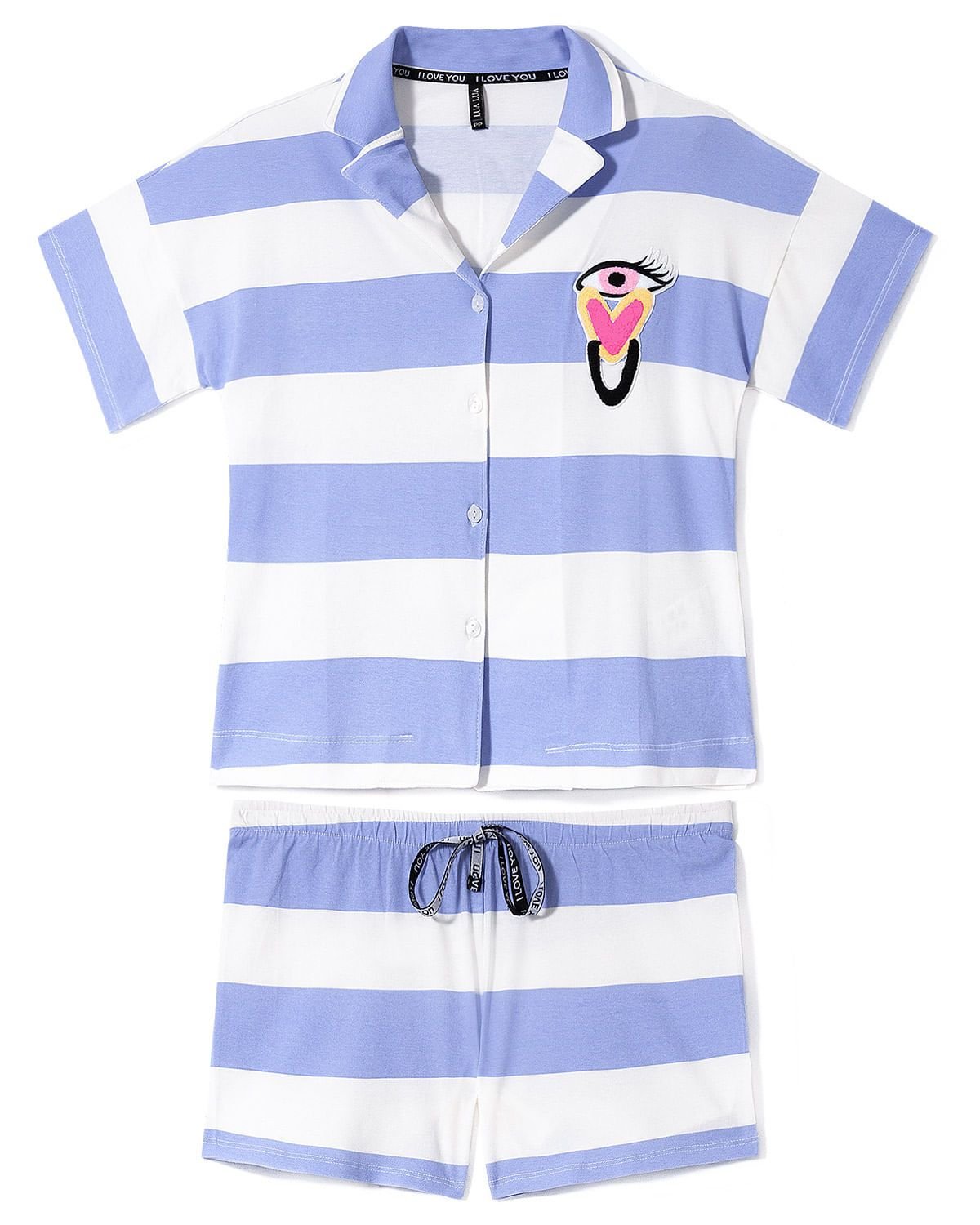 Seguindo a tendência de maxi listras, este pijama americano traz blusa de mangas curtas com abertura por botões com a frase "I love you" e o short possui amarração decorativa no cós de elástico. Confeccionado em Cotton Touch, tecido de toque extremamente macio que oferece aconchego aos momentos relax. Destaque para bordado em Chenille com detalhes em neon, o que garante modernidade ao conjunto.
