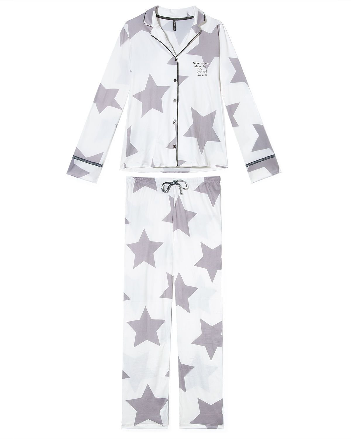 Sinta-se abraçada pelas estrelas com este lindo pijama americano confeccionado em sublime touch, tecido macio com tecnologia inteligente e qualidade de alto padrão. Esse conjunto traz abertura por botões que deixa o look super elegante e também é ótimo para as mamães por proporcionar praticidade na hora da amamentação. E calça acompanha lindo detalhe bordado com a escrita "Feel a starry moment" que traduzida "Sentir um momento estrelado" na fita decorativa no cós de elástico. Destaque para estampa com a frase "Wake me up when the stars are gone" que traduzida "Me acorde quando as estrelas se forem".