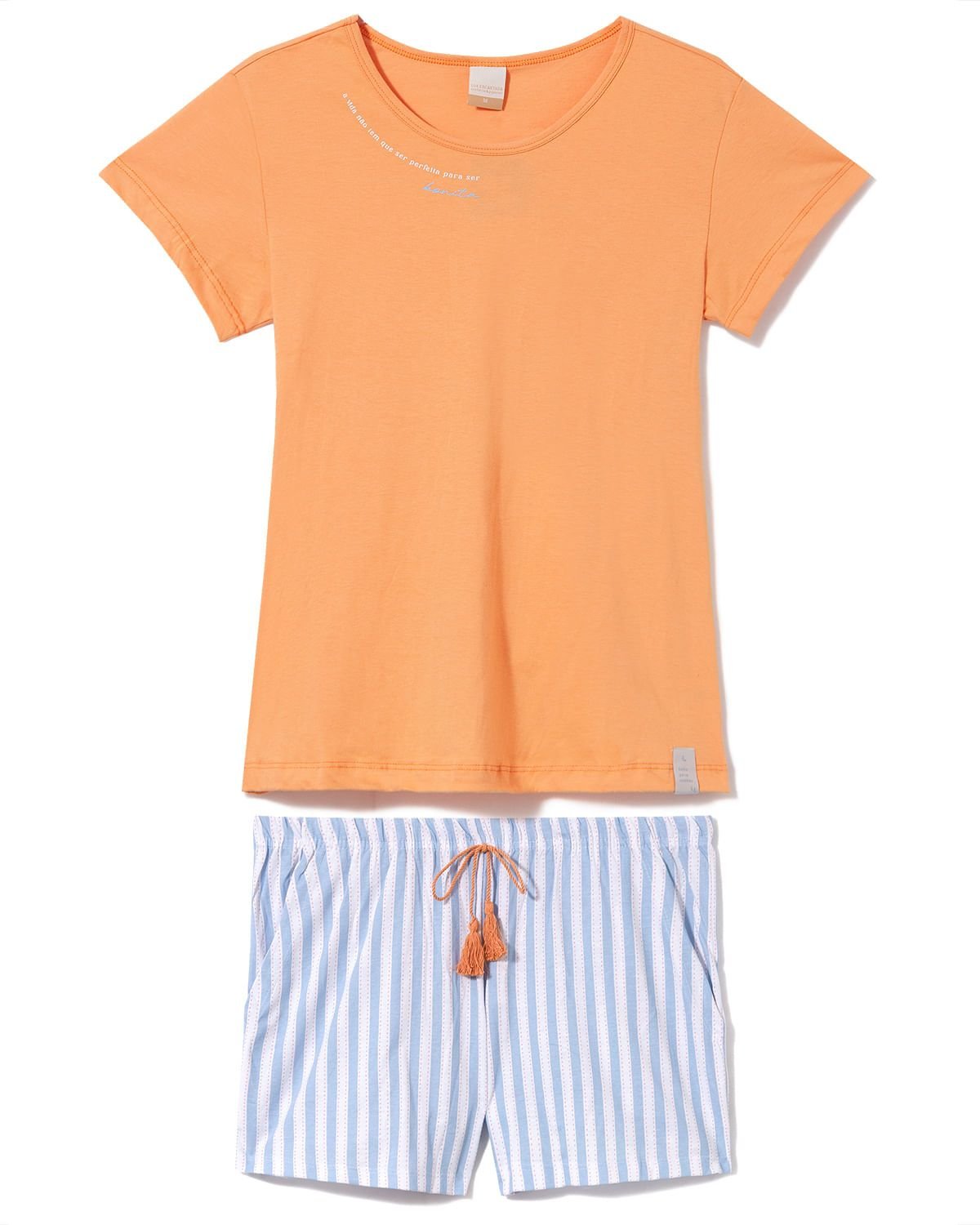 A frase contornando a gola e o laço com tassel no short acentuam o visual feminino.