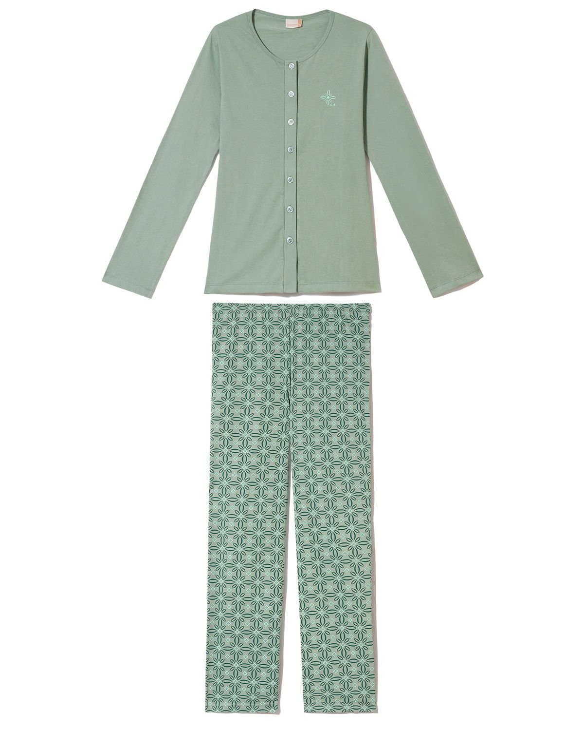 Os pijamas abertos além de práticos, trazem um charme a mais para os momentos relax. Confeccionado em 100% Algodão, que além da produção sustentável, as fibras, antes mesmo de se tornarem um tecido, passam pelo biopolimento, que consiste na separação de fibras mais longas e limpas para que o pijama tenha aparência de novo por muito mais tempo e ofereça maciez ao contato com a pele. Ah, e não posso me esquecer: esse beneficiamento torna este tecido hipoalergênico, ideal para quem tem a pele mais sensível. O conjunto traz blusa de gola canoa com abertura por botões e calça com estampa geométrica floral.