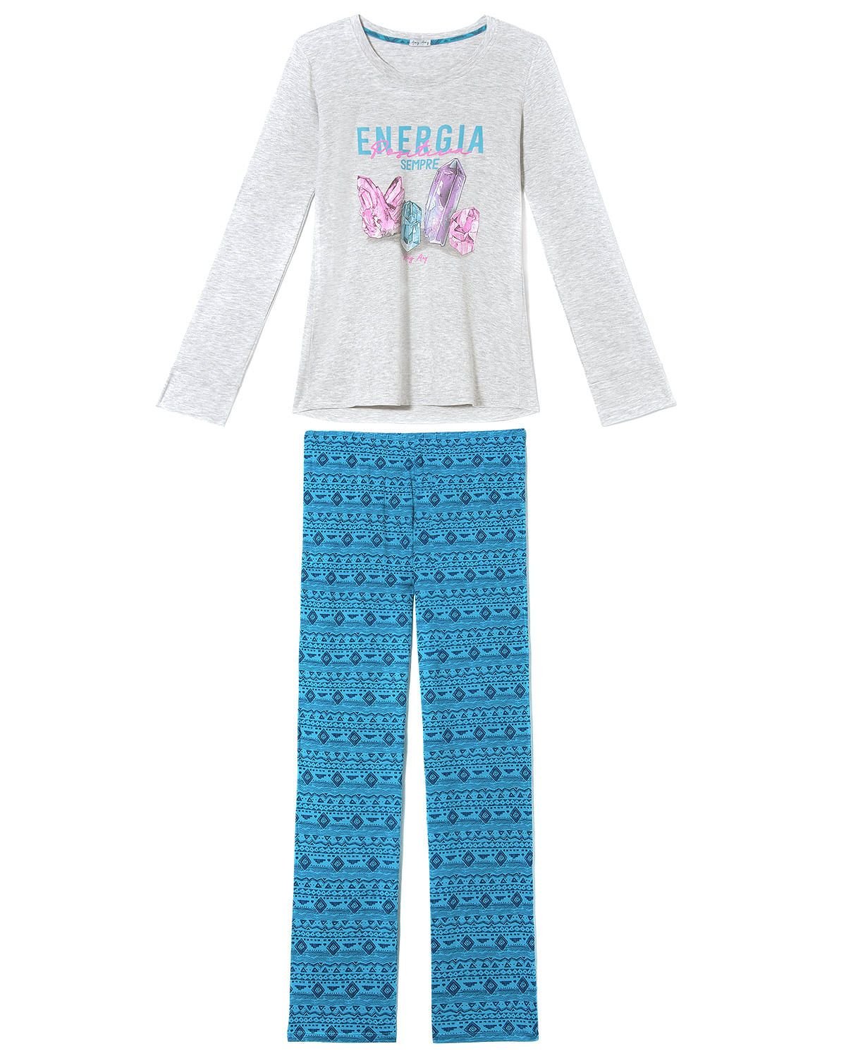 A sua energia positiva torna o mundo um lugar melhor e com este pijama suas energias estarão sempre renovadas. Confeccionado em visco premium, tecido com tratamento especial da Any Any, garantindo leveza e maciez para os momentos de descanso. Composto por blusa de mangas longas com abertura nos punhos, gola careca e calça com cós de elástico, esse modelo une a tendência étnica com a estampa em silk screen de cristais energéticos na blusa.