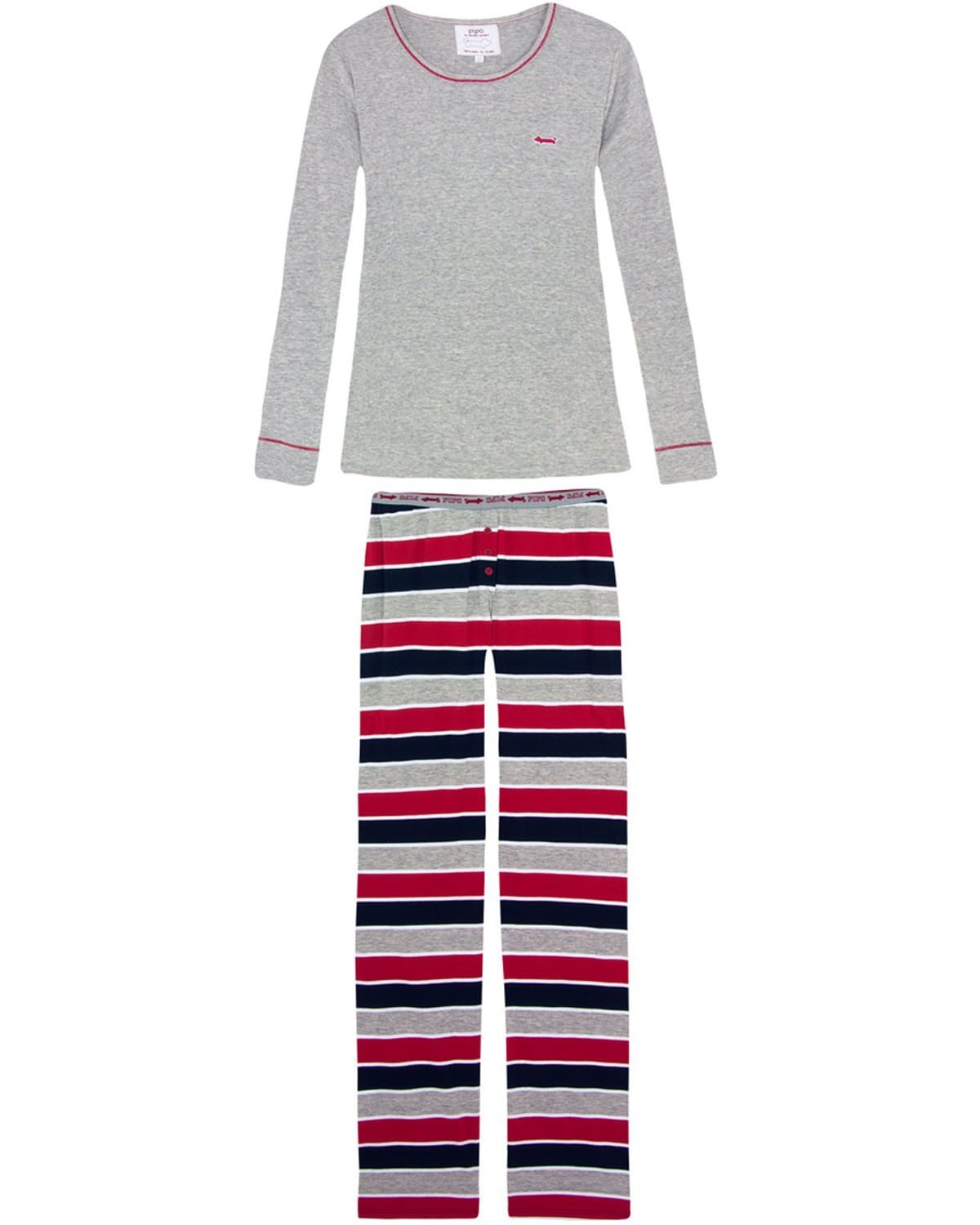 Este pijama é para a mulher que gosta de estar linda e moderna dentro de casa. Confeccionado em malha super macia, com calça toda listrada e blusa mescla manga longa. É a peça ideal para deixar seus momentos ainda mais confortáveis e femininos.