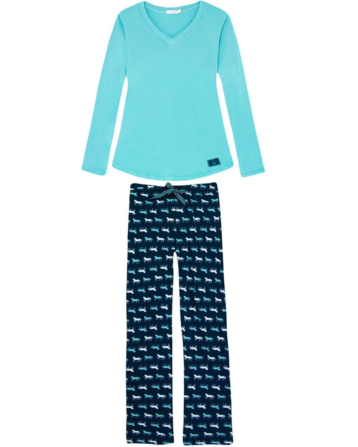 Este é aquele pijama para a mulher antenada que gosta de estar moderna e linda até dentro de casa. Confeccionado em 100% algodão de excelente qualidade, com blusa manga longa e calça em moderna estampa de cavalinhos. Modelo disponível para crianças para visuais 'tal mãe, tal filha' e 'tal mãe, tal filho'.