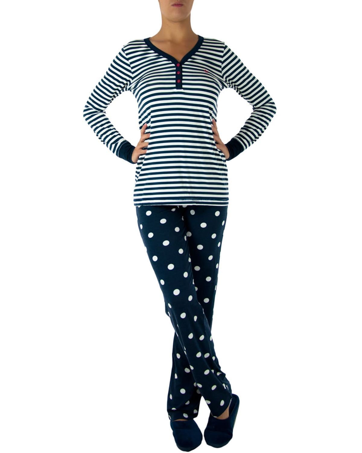 Na hora de dormir, vestir-se bem é fundamental. Para isso, este pijama é perfeito para a mulher que gosta de estar moderna e linda, sem abrir mão do conforto.Todo feito em viscose de excelente qualidade, com mix das estampas listras e poá com referencias no estilo Navy Chic. É o pijama certo para encher suas noites de conforto e beleza. Destaque para abertura frontal com botões, Modelo disponível também para crianças para looks 'Tal Mãe, tal filha'.