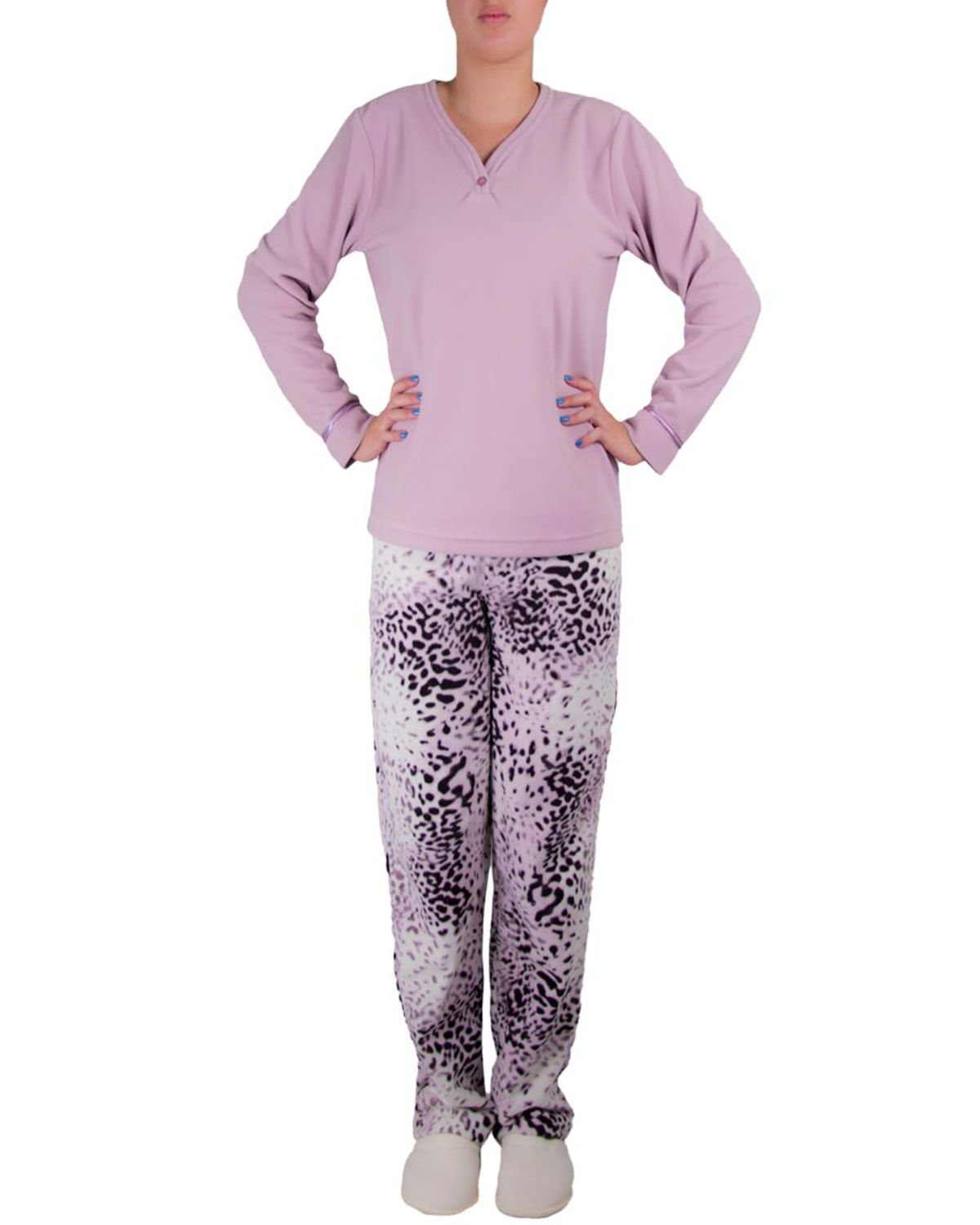 Confeccionado em soft de excelente qualidade, seguindo a estampa animal print na calça, e blusa com um discreto decote em V.