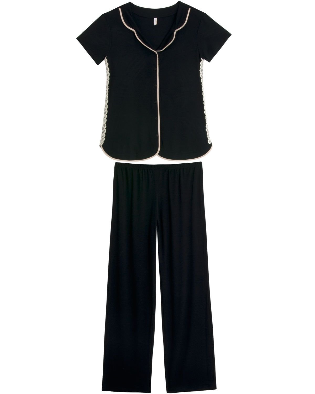 Um clássico repaginado, este pijama tem calça comprida e blusa manga curta aberta com gola, todo em viscolycra com fino acabamento em renda, perfeito para escolhas fáceis, femininas e certeiras.