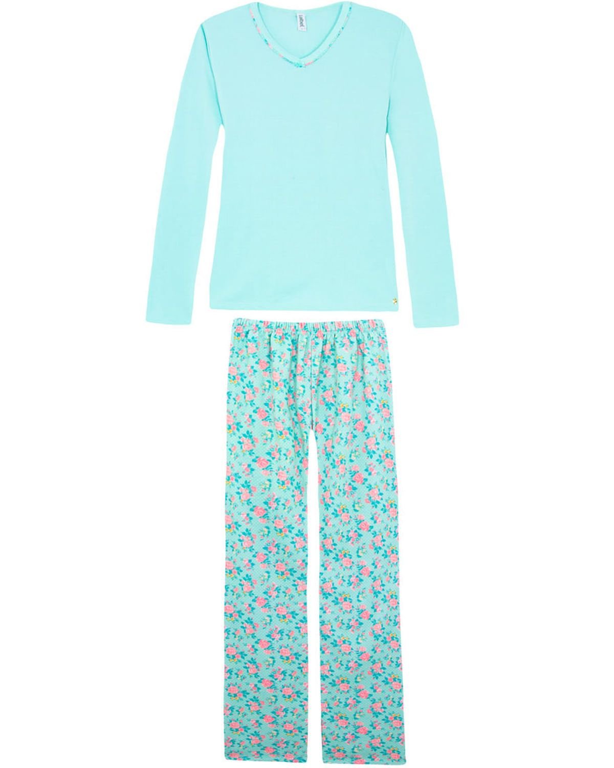 Este pijama é perfeito para momentos aconchegantes e quentinhas em noites de frio. Feito em moletinho peluciado, com calça comprida com estampa delicada de flores, e blusa lisa em modelagem clássica e tradicional.