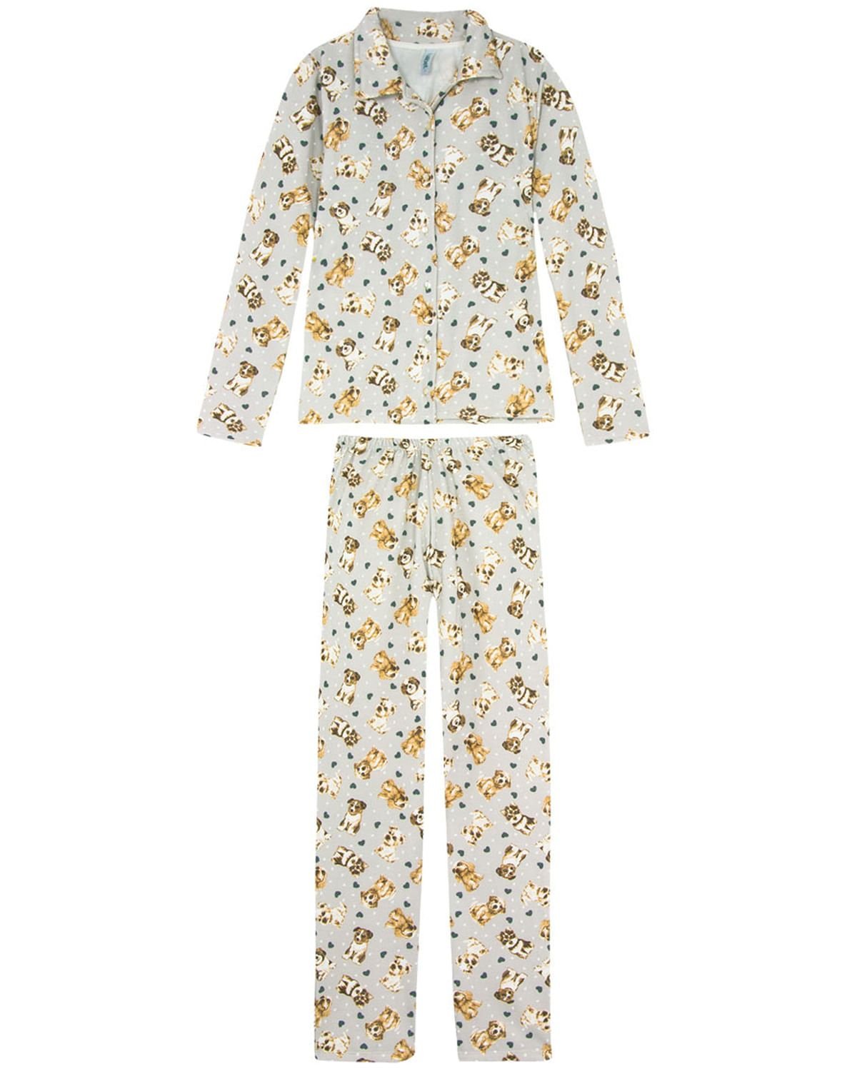 Este pijama é perfeito para noites aconchegantes e quentinhas nos dias de frio. Feito em moletinho peluciado, com calça comprida e abertura frontal na blusa, todo com estampa graciosa e feminina de cachorrinhos. É a peça ideal para noites confortáveis e mais alegres.