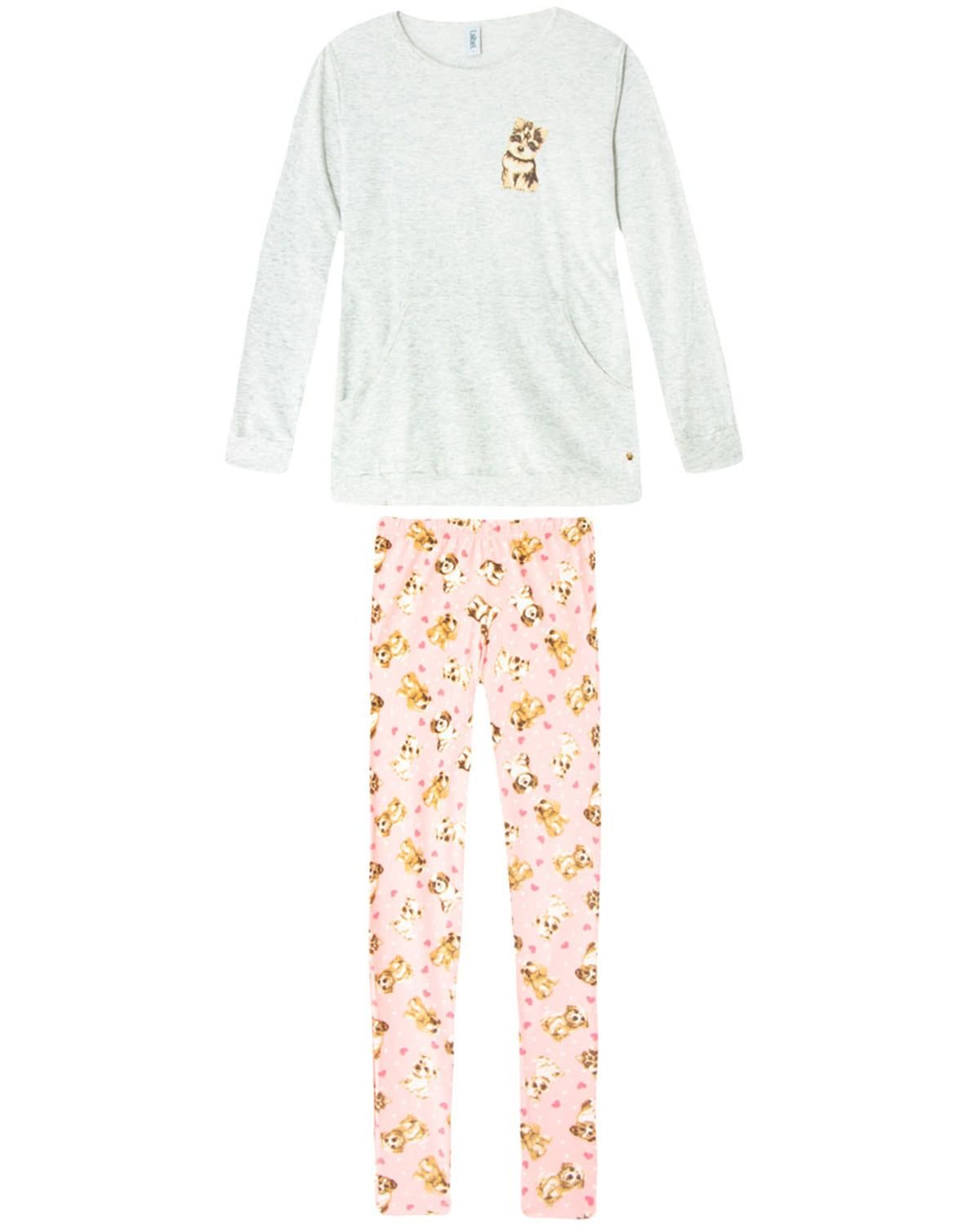 Este é aquele pijama ideal para a mulher que gosta de estar moderna e a vontade até dentro de casa. Com calça que se ajusta ao corpo no estilo legging toda estampada de graciosos cachorrinhos, acompanhada de blusa comprida com bolso canguru e pequena e delicada estampa. Perfeito para deixar suas noites ainda mais charmosas e confortáveis.