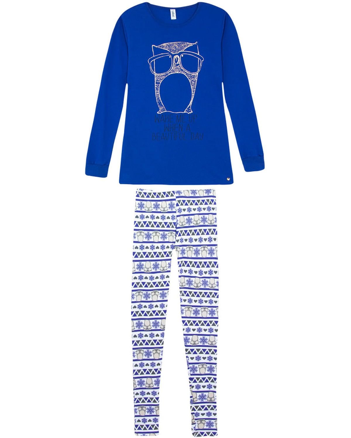 Este pijama é ideal para escolhas delicadas e femininas. Com calça estilo legging que se ajusta ao corpo e blusa comprida em moletinho com estampa dourada de uma coruja estilizada, garantindo modernidade, beleza e conforto para suas noites.