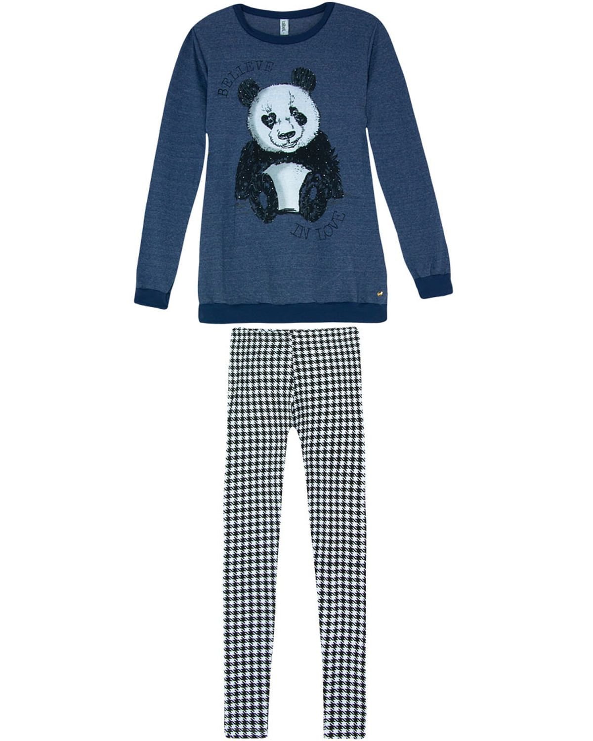 A estampa 'pied de poule' é uma das padronagens mais clássicas de inverno, e para as antenadas em moda este pijama vai ser aquele item indispensável para garantir noites confortáveis e cheias de beleza e personalidade. Com calça comprida ajustada ao corpo estilo legging toda na estampa 'pied de poule' e blusa comprida em moletinho flanelado com urso Panda estampado com acabamento em pedrinhas.