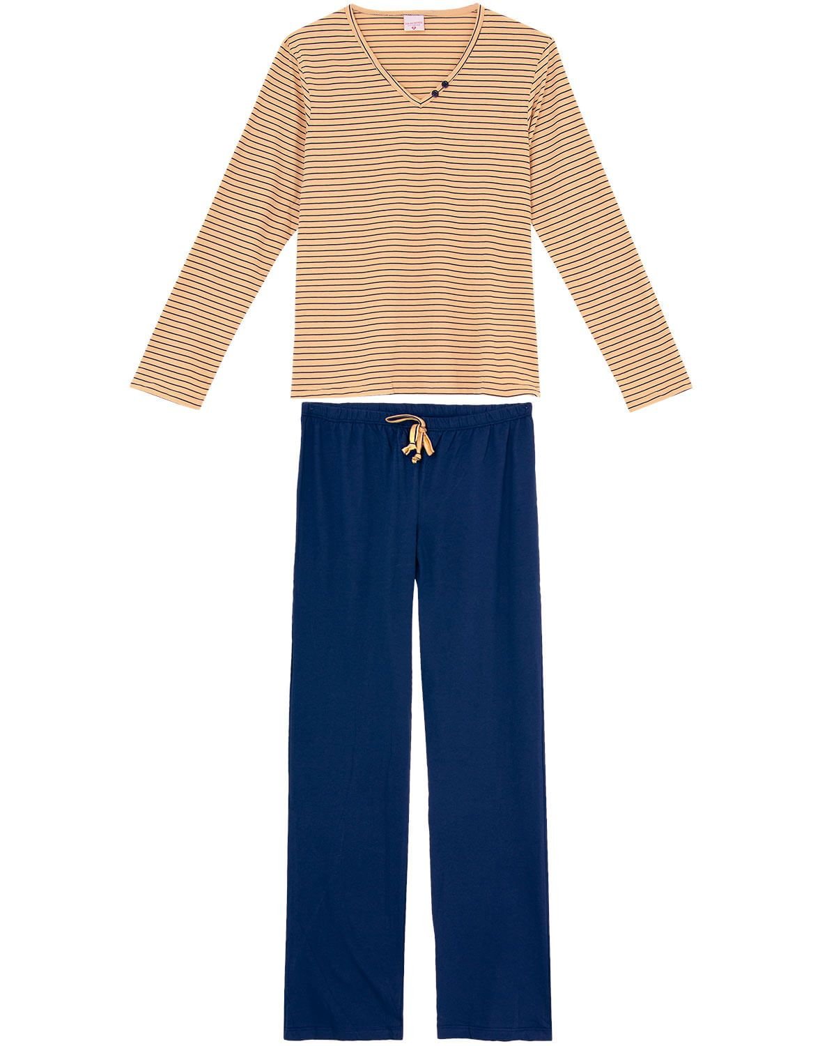 O conforto é a prioridade quando se trata de pijamas. Esse conjunto confeccionado em algodão, é ideal para aqueles dias em que a temperatura começa esfriar, sua malha leve e macia garante uma tranquila noite de sono. A blusa de manga longa em malha listrada, possui decote V com botões, que faz um conjunto super jovial com a calça azul marinha.