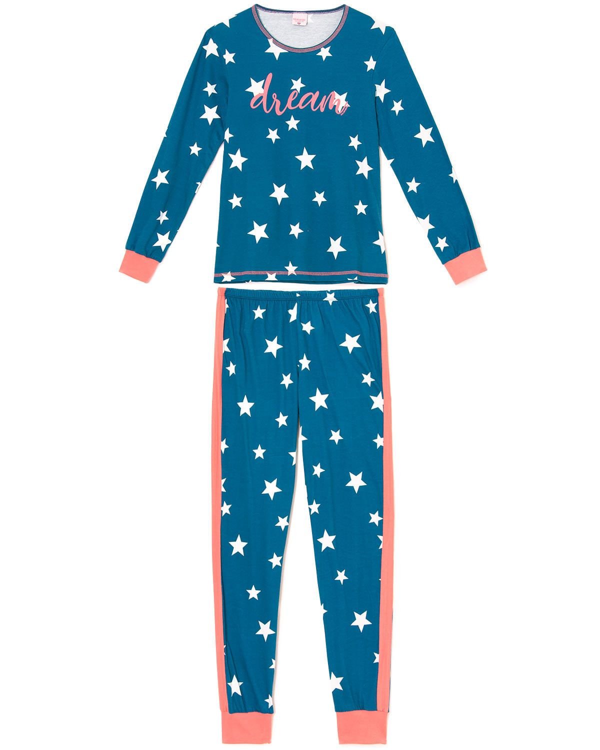 Nada melhor que dormir olhando para as estrelas. Este pijama todo estampado com estrelas possui punhos na blusa e na calça que tem o charme das faixa nas laterais em neon, fazendo assim um lindo conjunto para as noites de sono. Destaque para as costura contrastante na gola e no barrado da blusa.