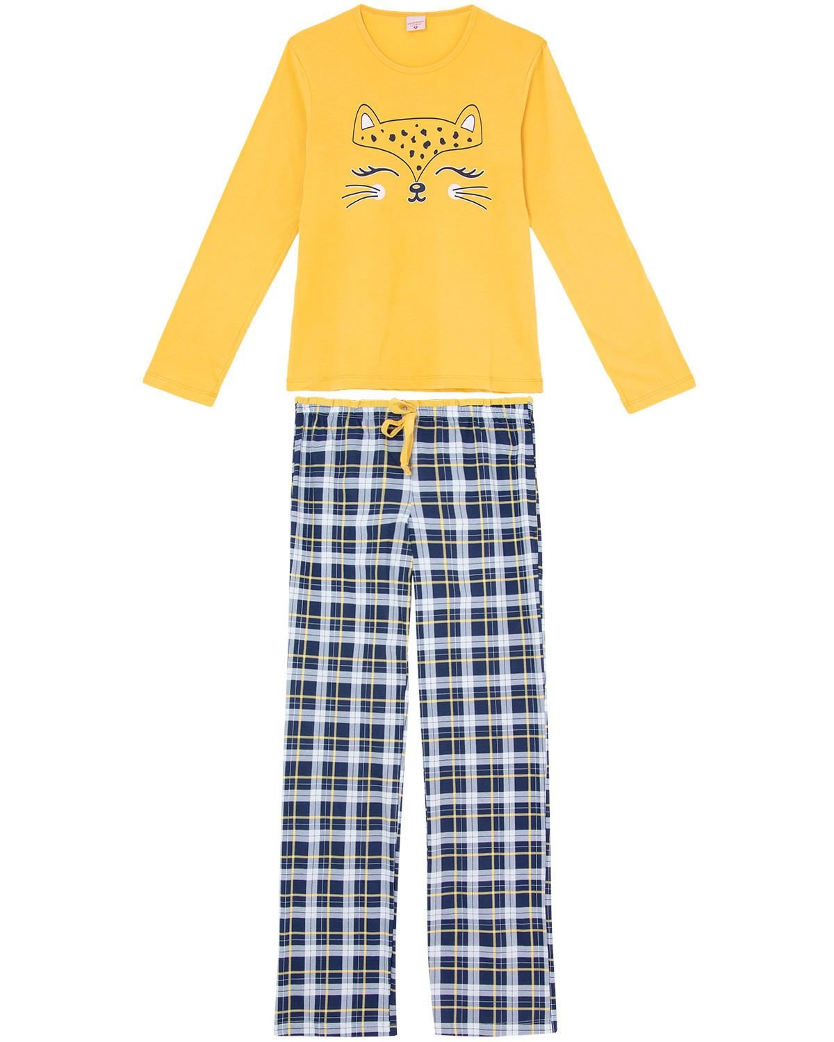 Um pijama que não pode faltar nas sessões de pipoca e no aconchego de sua casa. Além das cores que se destacam e agregam um estilo divertido para a peça, a estampa de oncinha brilha no escuro! E para completar este pijama incrível, a calça com amarração no cós, é toda estampada em malha xadrez, criando um conjunto moderno.