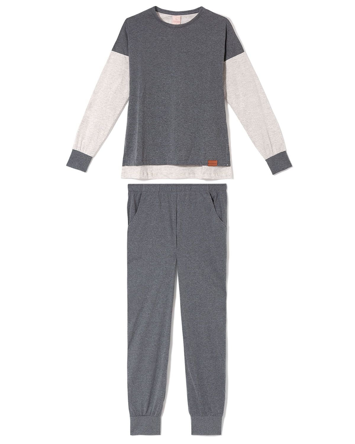 Toda mulher quer em seu closet, um pijama confortável para os momentos de descanso. Trouxemos esta proposta em malha de Algodão mescla, de mangas com punhos. A calça com bolsos possui cós de elástico e também punhos no barrado, tornando assim, um conjunto harmônico. A modelagem anatômica com excelente caimento, agregado a um toque leve, é ideal também para compor um look loungewear, que são looks do dia a dia com peças super confortáveis.
