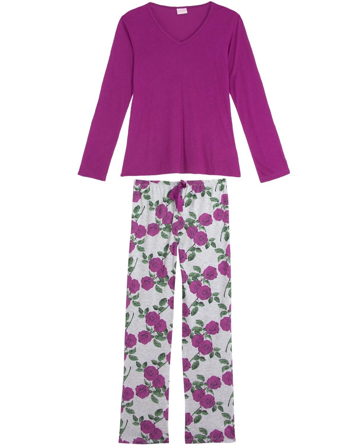 Pijamas clássicos e com cores vivas são perfeitos para alegrar aquelas noites frias de inverno. Esse modelo é elegante e fino, proporcionando um visual moderno para todas as mulheres. É todo feito em viscose de excelente qualidade, possui blusa lisa na cor rosa e calça com estampa de flores complementando o visual perfeito.