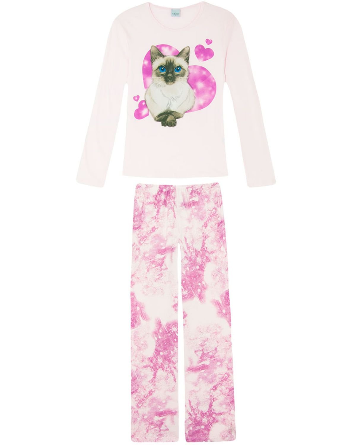 Este pijama é todo confeccionado em 100% algodão, com blusa manga longa com feminina estampa de gato e corações, acompanhada de calça comprida, proporcionando noites muito mais alegres e cheias de conforto.