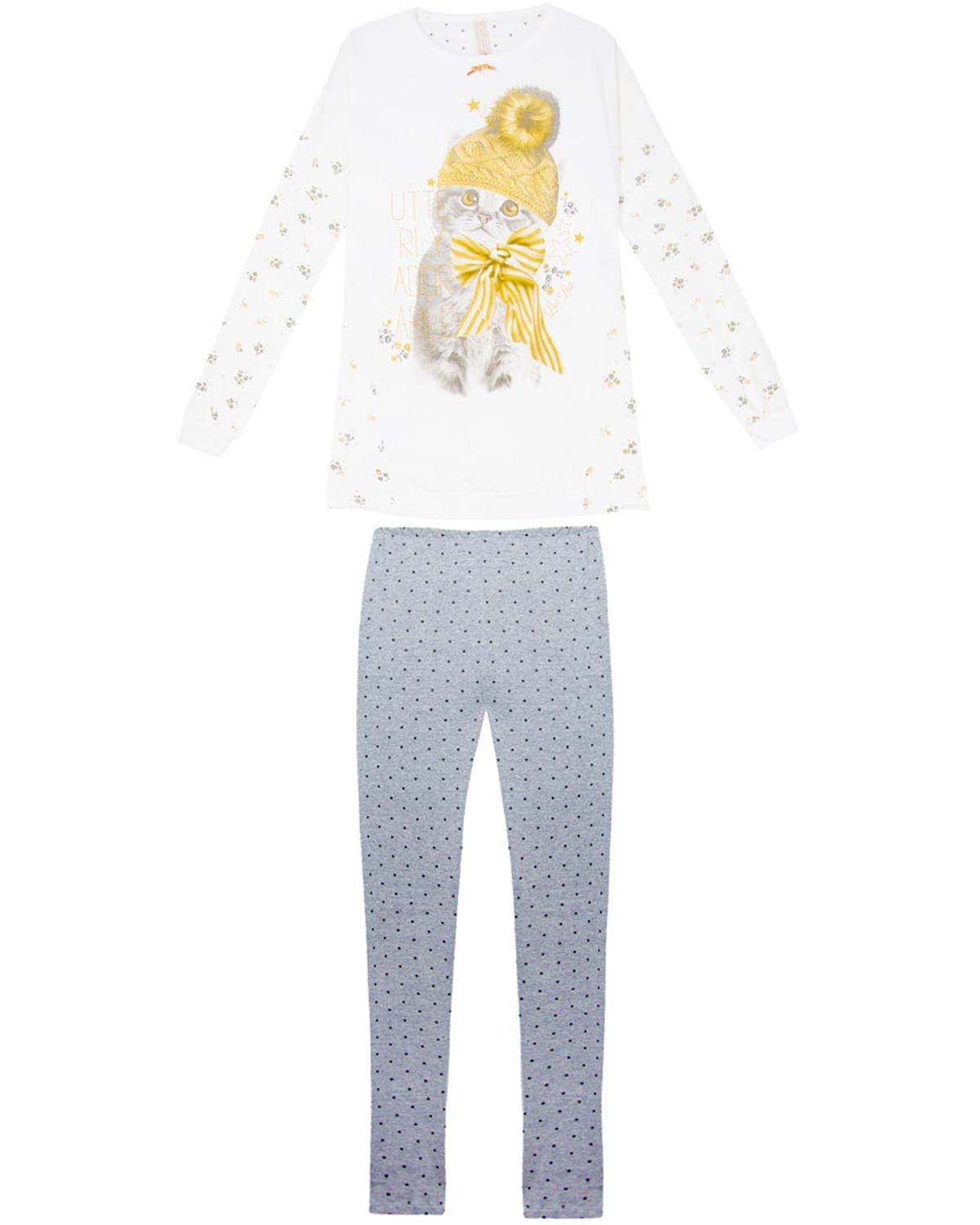 Este pijama tem um toque macio e é super confortável. Blusa tipo moleton com estampa de gato na parte frontal, detalhe nas mangas, cintura e costas com estampas de pequenas flores, calça legging básica com estampa de estrelinhas. Lindo e delicado na medida. Destaque para laço de cetim com pingente na gola