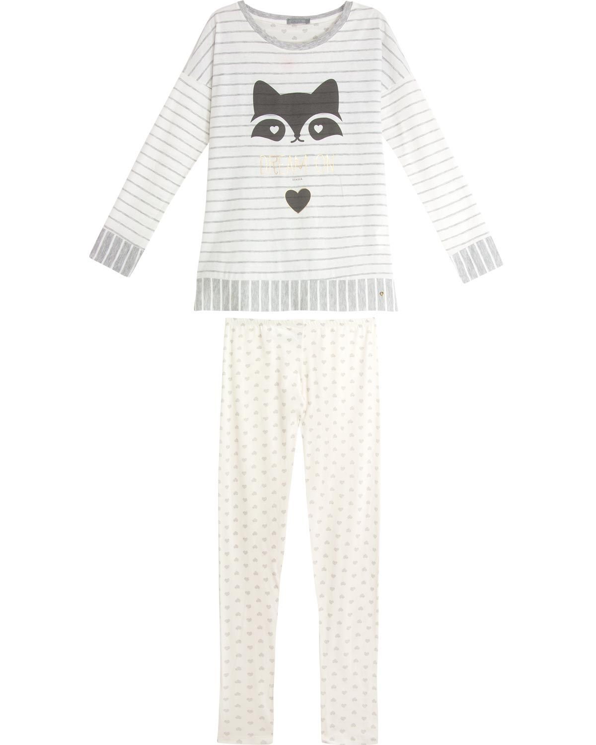 Pijamas quentinhos e confortáveis são o que todos procuram para as noites frias de inverno. Esse pijama com malha de excelente qualidade proporciona isso e ainda acrescenta um toque ideal de feminilidade com estampa de guaxinim na blusa e corações em toda a calça legging. Pronto, suas noites tranquilas e agradáveis estão garantidas.
