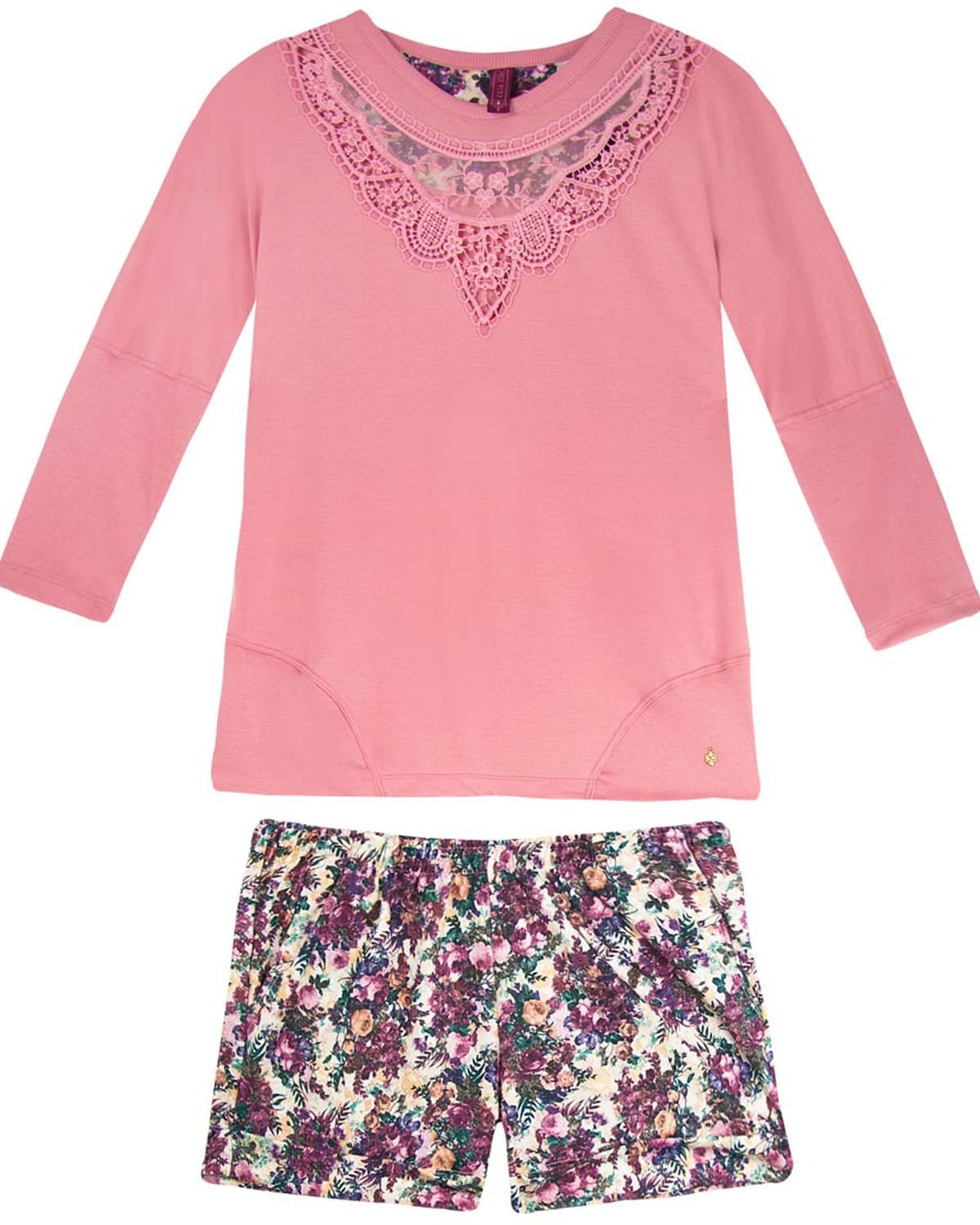 O pijama curto uni o conforto da malha na blusa de manga meia estação e o charme da renda em sua gola, seu shorts com bolso, trás uma linda estampa floral trazendo beleza e priorizando o conforto para suas noites. Delicado, gracioso e moderno na medida.