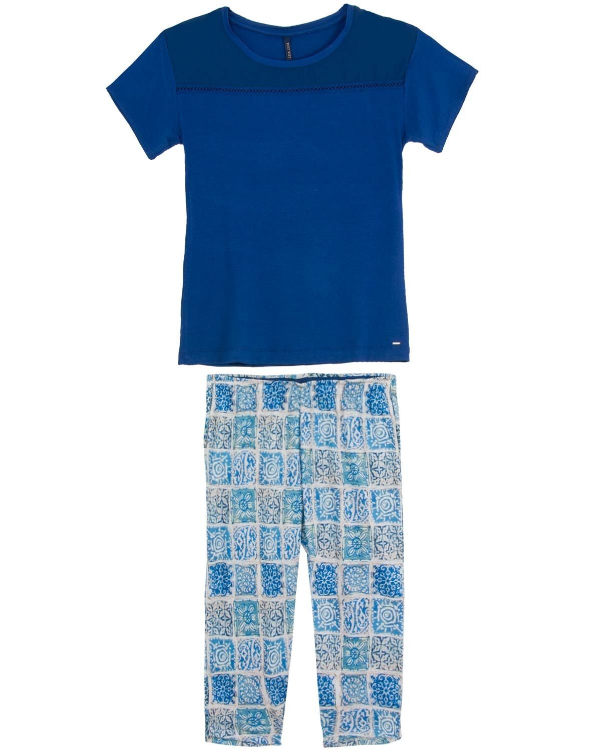 Não existe nada melhor do que a sensação de chegar em casa depois de um dia longo e colocar aquele pijama confortável e lindo para se sentir bela até mesmo na hora de dormir. Esse modelo possui camiseta lisa com detalhes em tule transparente no busto e calça pescador com estampa étinica de flores, garantindo um visual diferente e moderno. A praticidade e o conforto ficam por conta da malha de excelente qualidade feita em poliéster e viscose. Perfeito para noites alegres e sonos tranquilos.